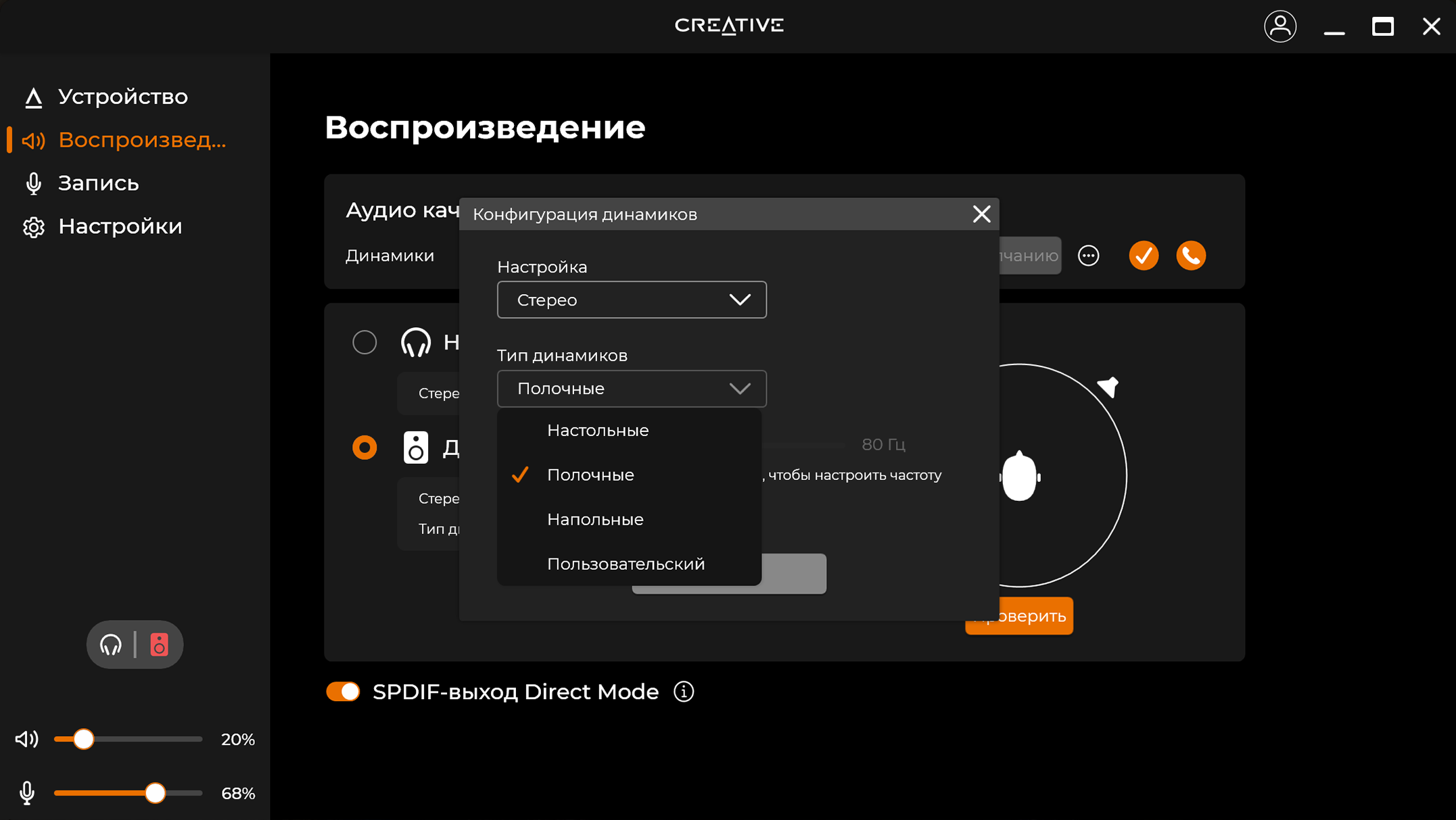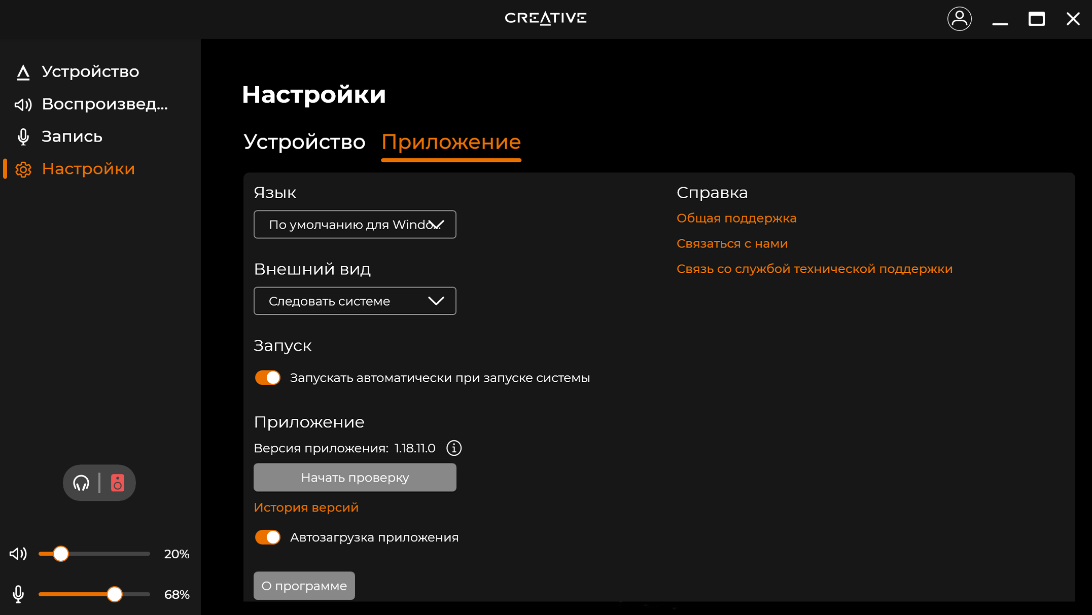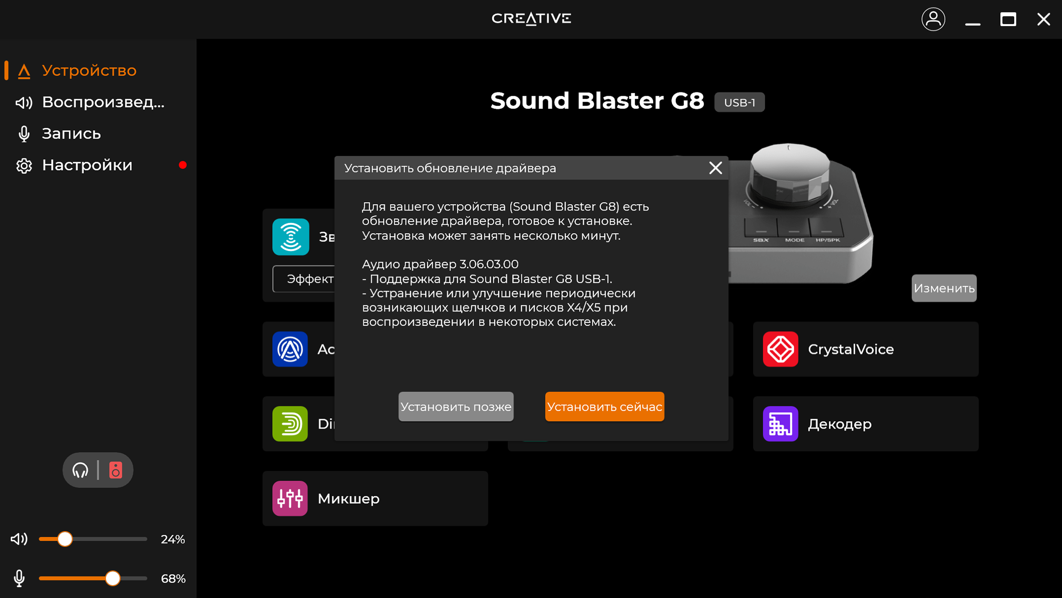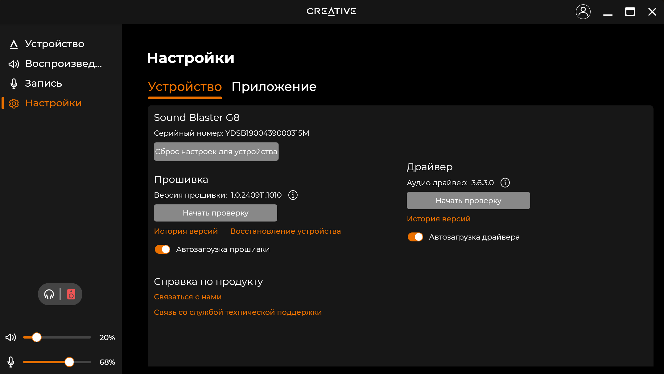 Для доступа к различным настройкам и «продвинутым» функциям Creative Sound Blaster G8 стоит непременно установить ПО Creative App, скачиваемое с официального сайта производителя. На момент подготовки обзора там можно было найти только версию под Windows, поддержку Mac OS производитель обещает в 1 квартале 2025 года. После завершения инсталляции программа проверяет наличие обновлений, если находит — предлагает установить.