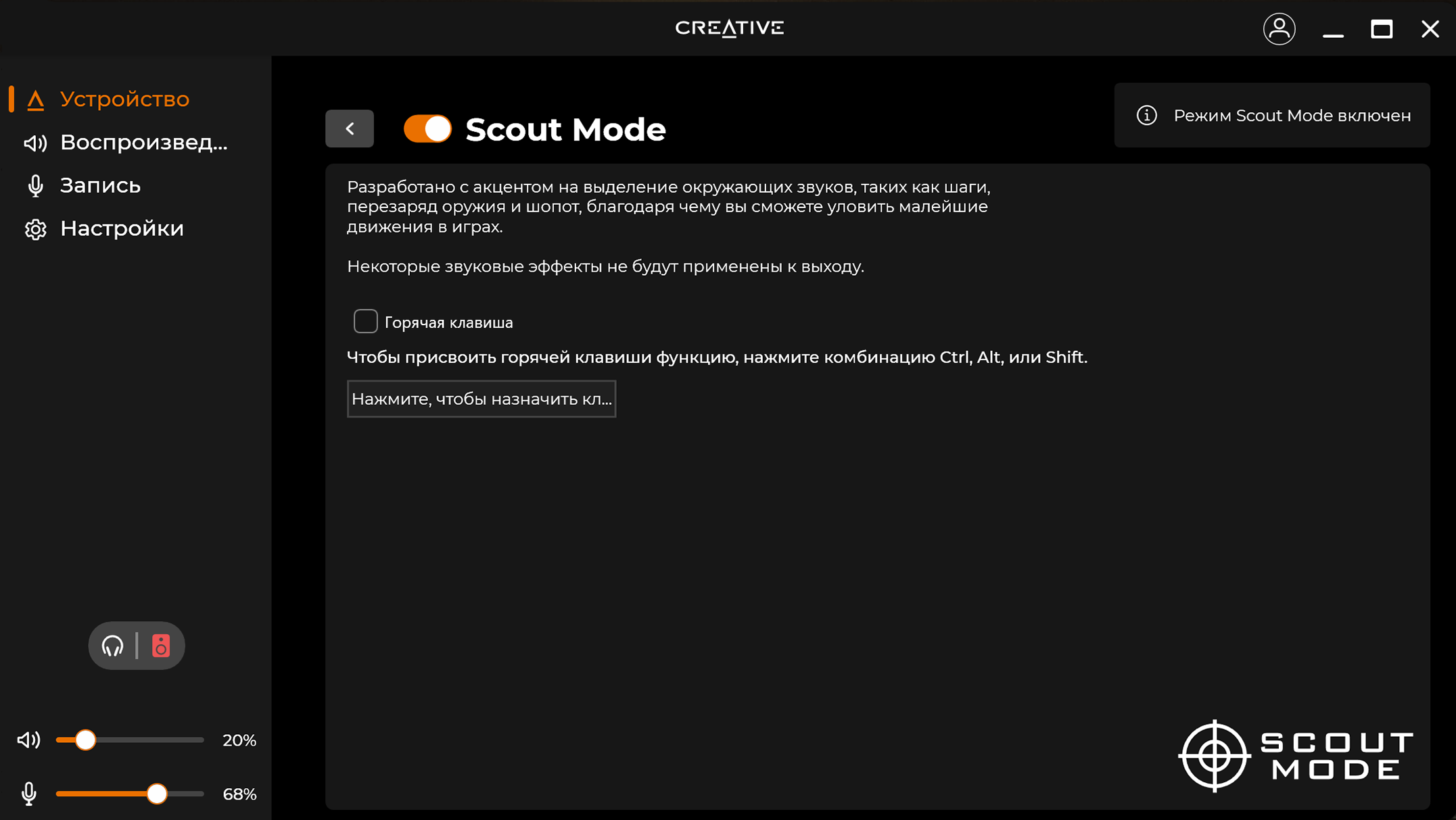 Режим Scout Mode позиционируется как отдельная «фишка» Creative Sound Blaster G8. По замыслу создателей, он должен обеспечить обладателям карты преимущество во всяческих шутерах, подчеркнув звуки шагов, перезарядки оружия и прочих важных игровых событий. О том, как он это делает, тоже поговорим в главе про звук.