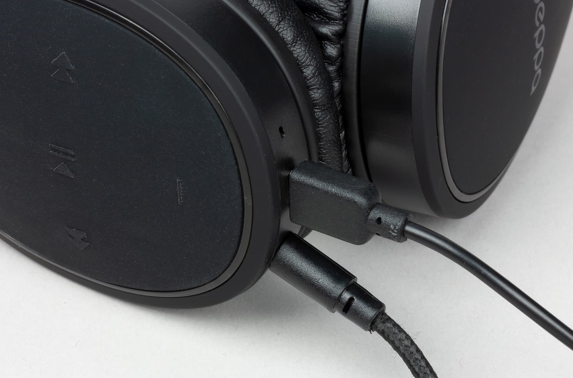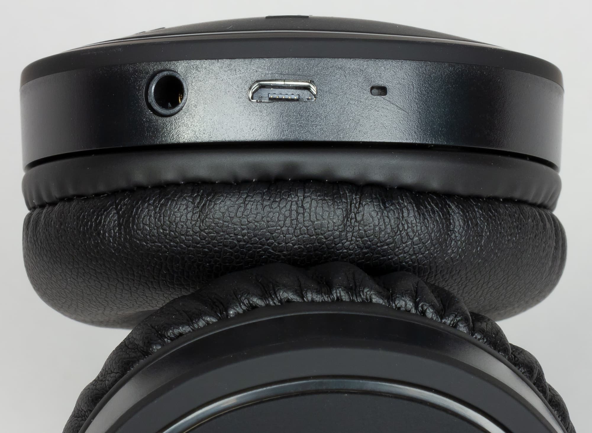 На нижней грани левой чашки расположены 3,5-миллиметровый вход для подключения проводного источника звука, порт Micro-USB для зарядки наушников и отверстие микрофона.