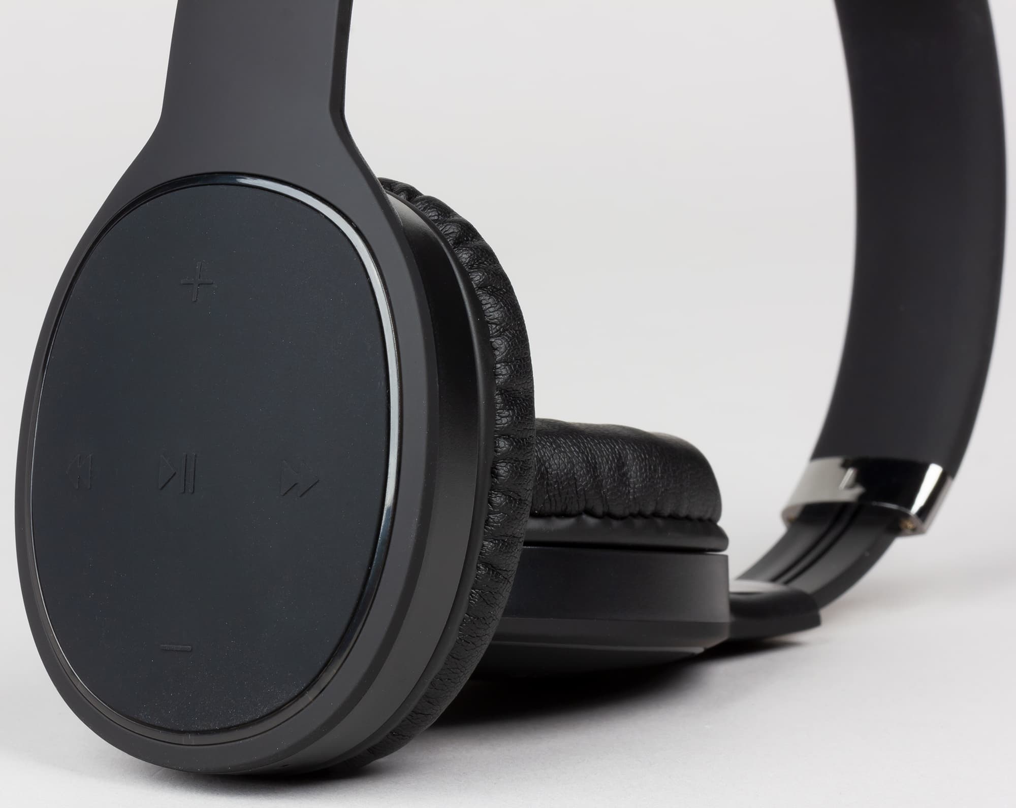 На внешней стороне правой чашки находятся клавиши управления наушниками: включение/ответ на звонок/запуск и остановка проигрывания, увеличение и уменьшение громкости, смена трека. У клавиш достаточно короткий ход, однако щелчок ясный и отчетливый. Обозначения клавиш рельефные, что, после небольшого привыкания, позволяет использовать их вслепую. Над кнопкой увеличения громкости, в центре верхней части пластиковой вставки, расположен индикатор работы.