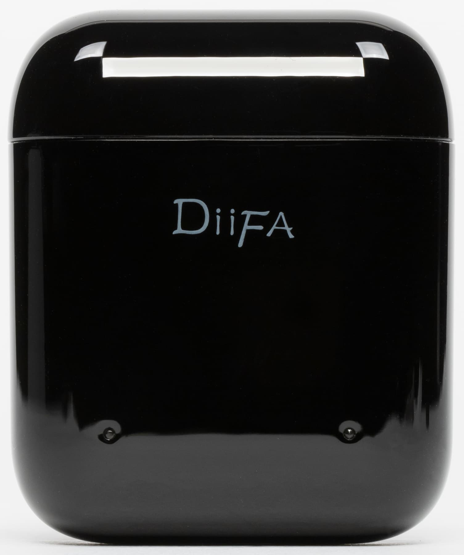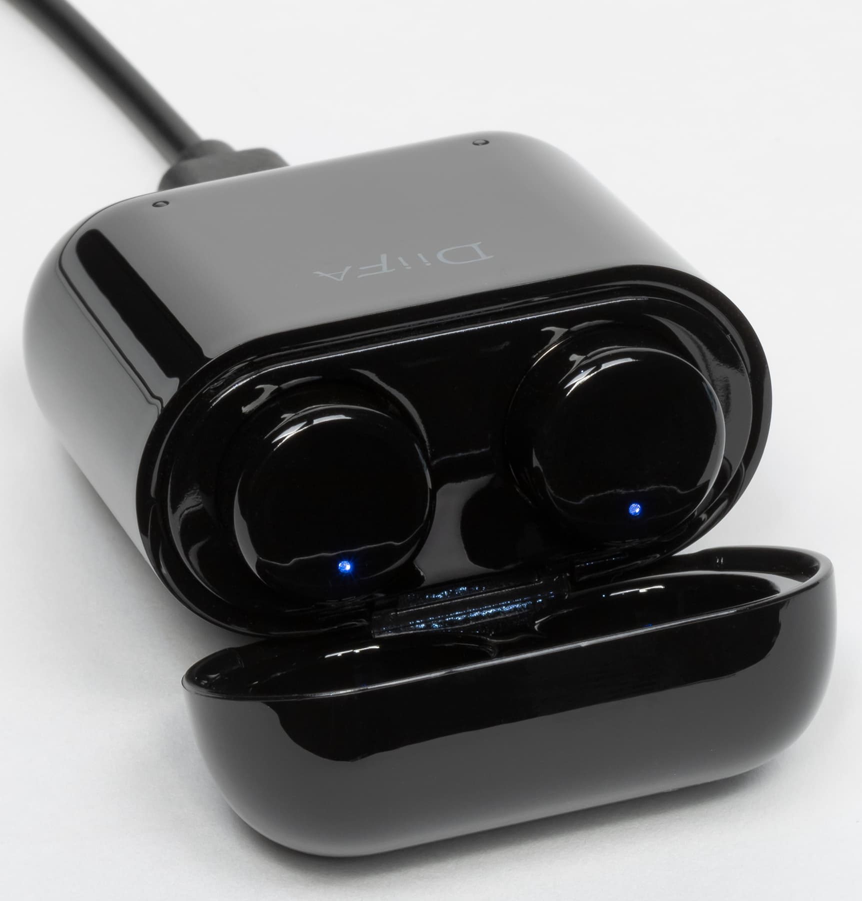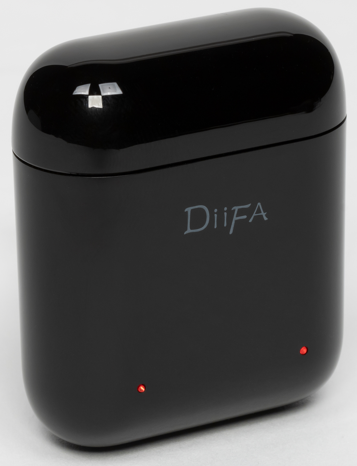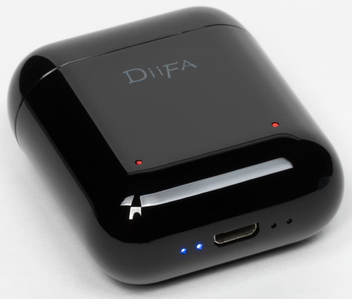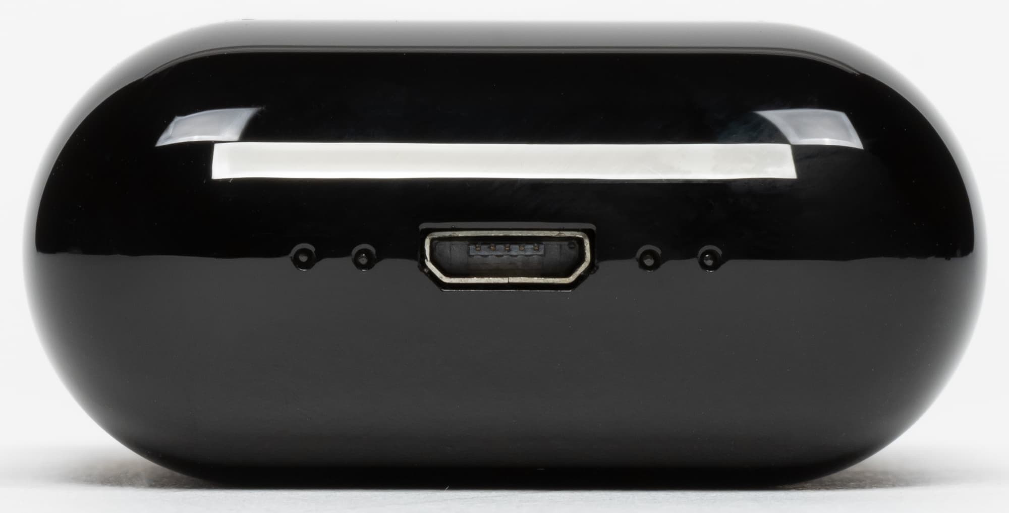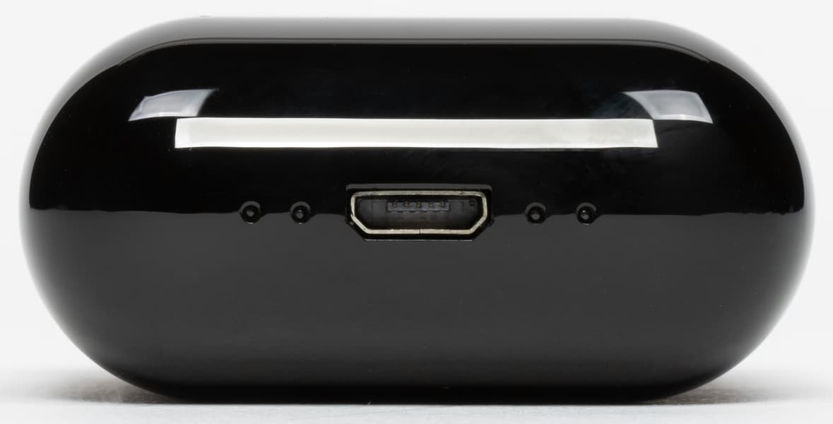 Выполнен чехол из глянцевого пластика. Выглядит неплохо, но появлению отпечатков пальцев просто крайне неустойчив. В нижней части размещены два индикатора зарядки — отдельный для каждого из наушников.