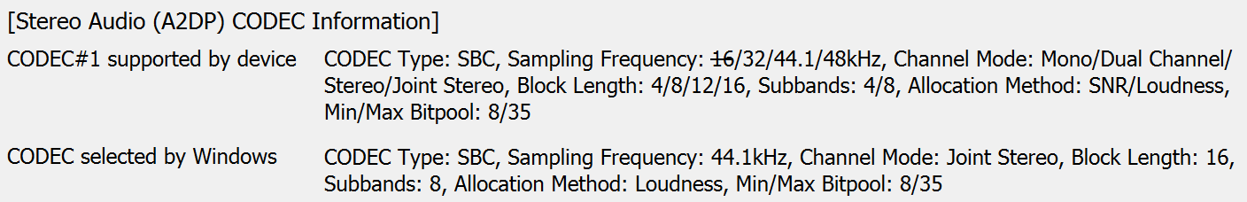 Мультипойнт у гарнитуры заявлен, голосовое сообщение на английском постоянно извещает о том, что «подключено второе устройство». Вроде как, при этом должно быть и первое, но по факту подключить гарнитуру к ПК под управлением Windows 10 и смартфону нам не удалось. После разрыва связи гарнитура легко подключалась к компьютеру, но при этом он становился единственным сопряженным устройством. Параллельно с помощью утилиты Bluetooth Tweaker был получен полный список поддерживаемых кодеков и их режимов.