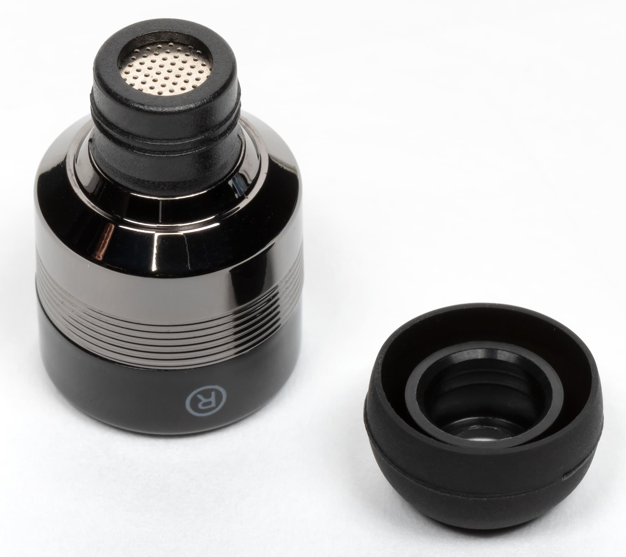 Отверстие звуковода закрыто металлической сеткой, которая не только защищает его от загрязнений, но и служит контактом для зарядки.
