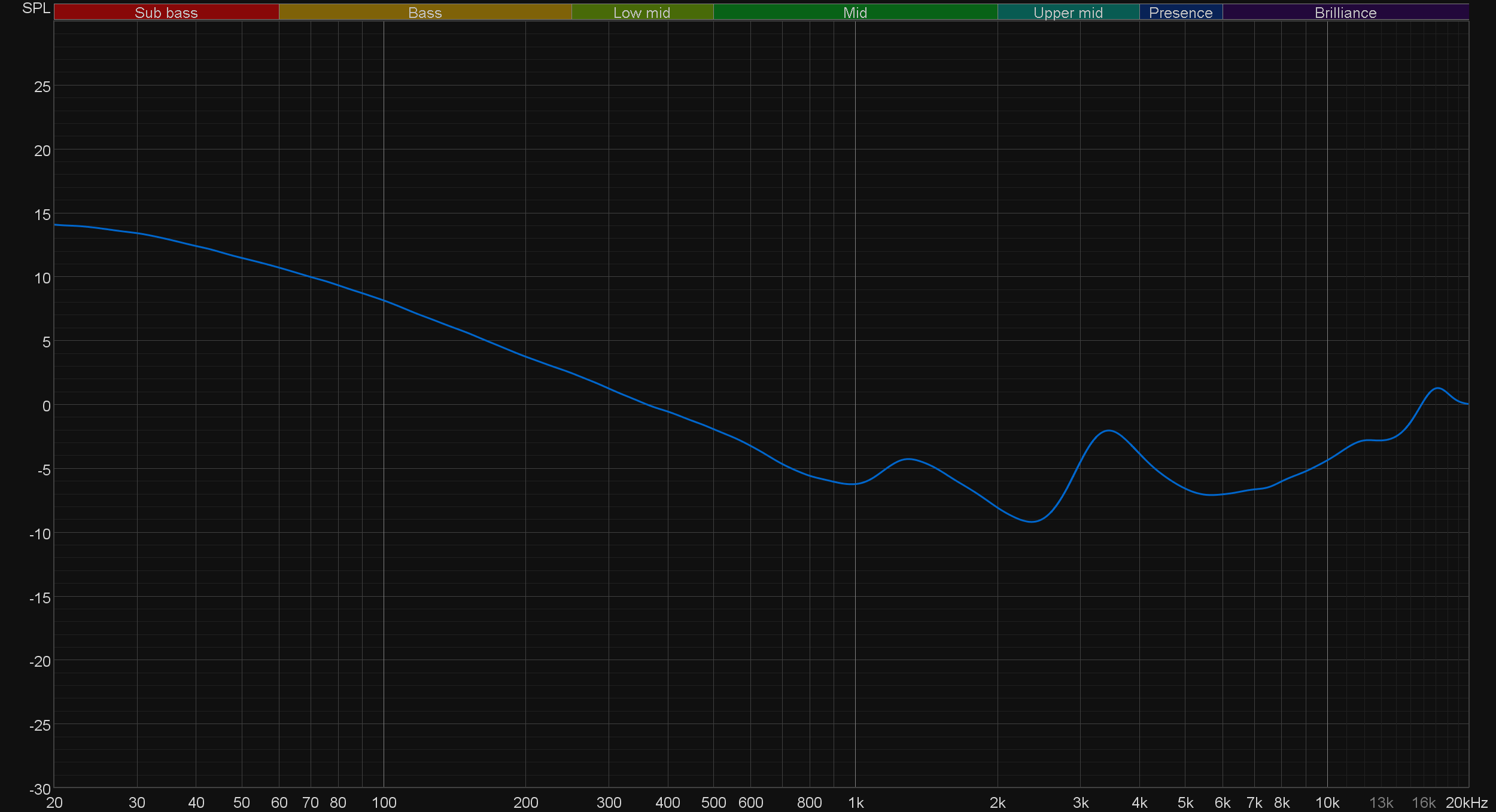 Качество звука у героини сегодняшнего обзора, скажем так, «очень среднее». Гулкий низкочастотный диапазон мешает восприятию середины, верхние частоты подаются очень контурно, особенно в треках с акцентами на басовых партиях. Вокал звучит несколько отстраненно за счет «проваленной» середины. Давайте сразу взглянем на график АЧХ.