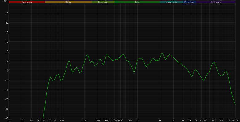 Звучание колонки удивило даже больше, чем многое другое. То есть, конечно, это малюсенькая колонка с одним динамиком диаметром 48 мм — ожидать от нее многого явно не стоит. Вот мы и не ожидали, а она выдала громкий и далеко не самый ужасный звук. Даже НЧ-диапазон вполне различим, средние так и вовсе неплохо так читаются, да и высокие тоже присутствуют в нужных количествах. Конечно, ни про какую детализацию, стереоэффект и прочее тут говорить не приходится. Но звук, как минимум, не раздражающий и лишенный серьезных дефектов, что уже отлично. Всё видно на графике АЧХ, который был получен при размещении измерительного микрофона на расстоянии 50 см и чуть выше колонки — примерно там, где находится голова сидящего за столом слушателя, если Divoom DitooMic стоит на этом самом столе.