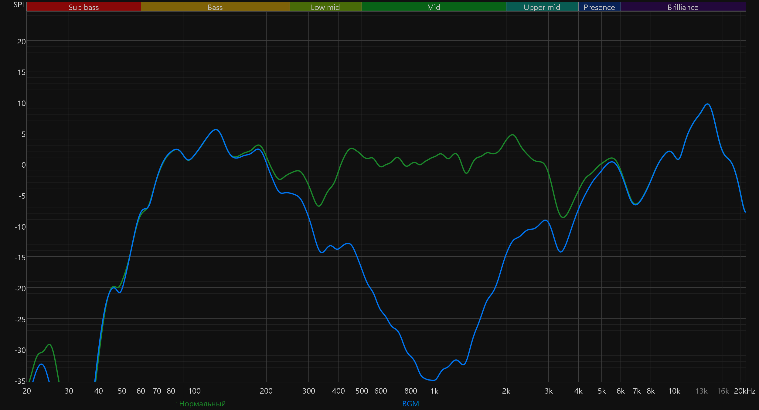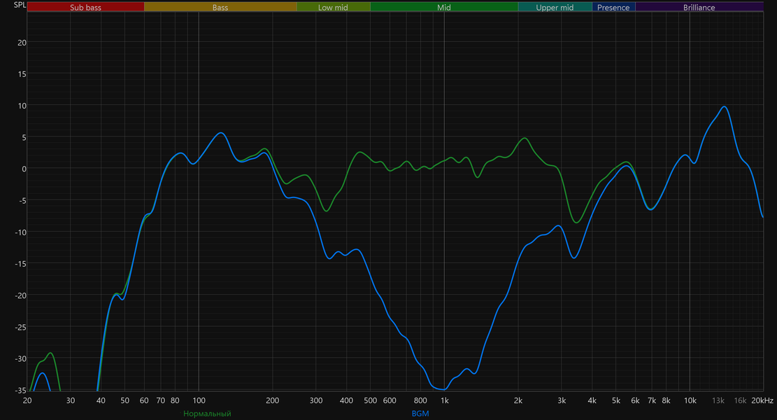 Посмотрим, как работает режим BGM, «убирающий» вокал из трека. Прямо скажем, радикально работает — просто убирает всю середину целиком, не щадя верхнюю и нижнюю ее часть. После взгляда на график ниже идея найти нормальные минусовки для караоке выглядит еще более разумной.