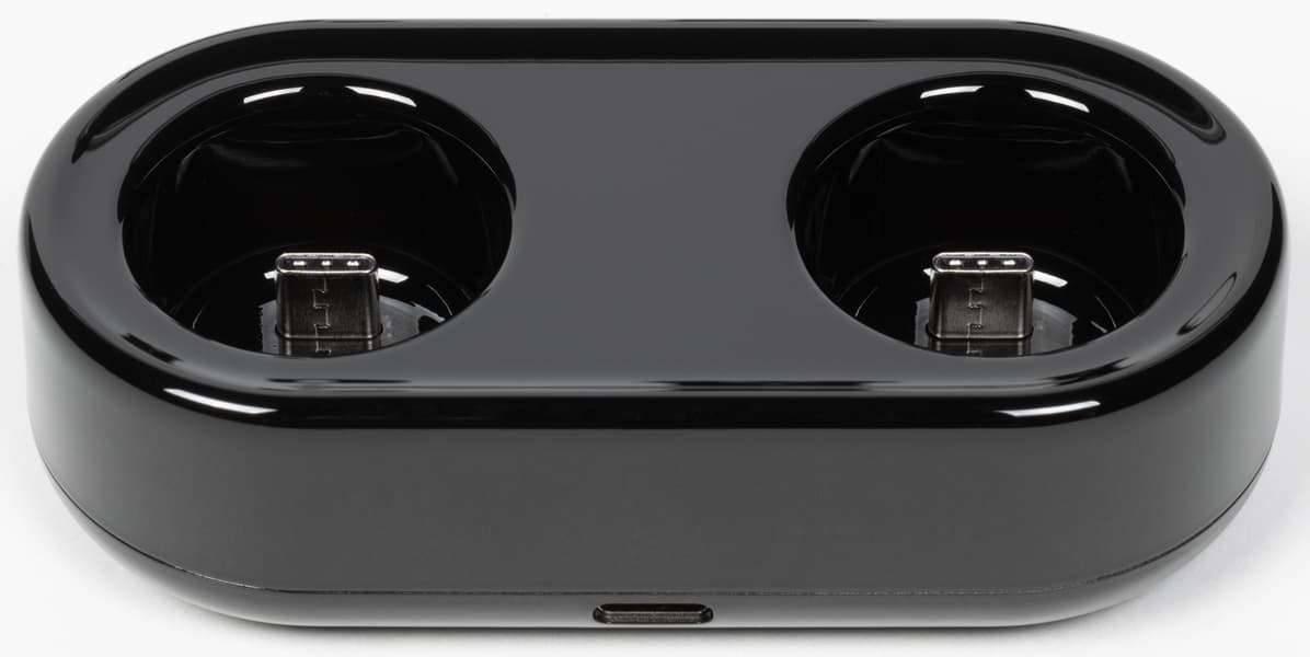 Сама база для зарядки довольно компактная, на переднюю сторону нанесен логотип. Микрофоны входят в свои слоты без лишних усилий, главное — правильно попасть в разъем. А вот достать их бывает чуть сложновато, док-станцию однозначно придется придерживать свободной рукой.