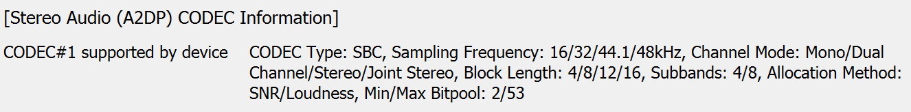 Кодек один — базовый SBC, верхний предел параметра Bitpool выставлен на уровне 53, тогда как рекомендованный профиль High Quality подразумевает значение 51. Так что он отработает на максимуме своих возможностей, которых достаточно для переносной пластиковой акустики.