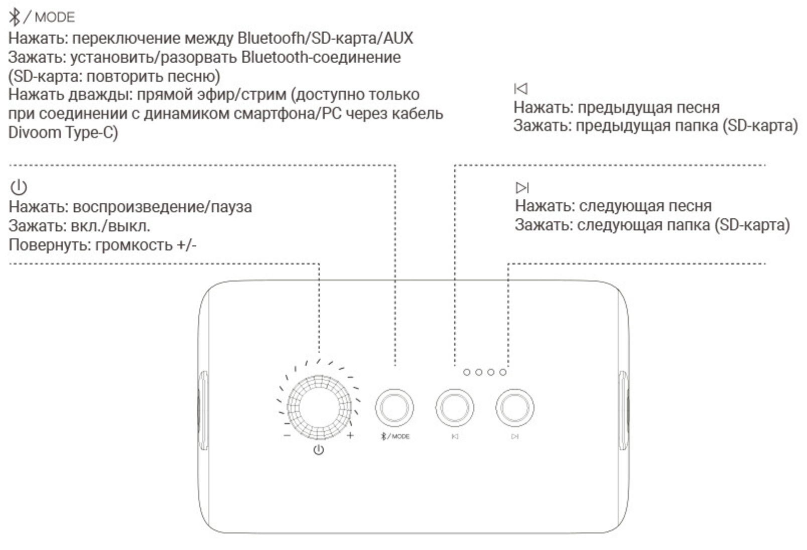 Вновь обратимся к иллюстрации из инструкции, чтобы наглядно показать предназначение всех элементов панели управления. Громкость микрофона изменяется исключительно регулятором на его корпусе и не зависит от выставленного общего уровня. В целом, если колонка оставляет ощущение более-менее солидного устройства, то микрофон — по ощущениям всё же игрушка.