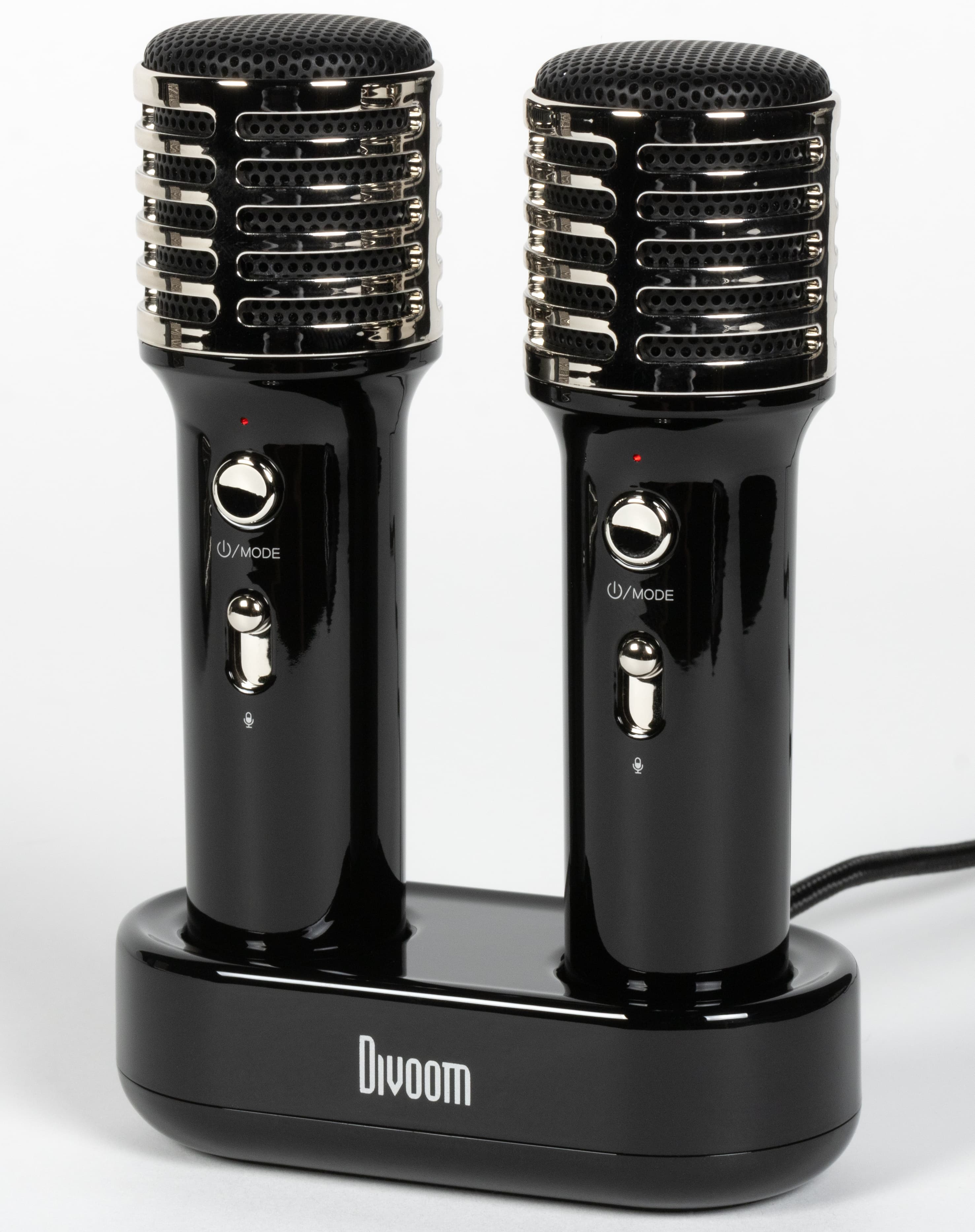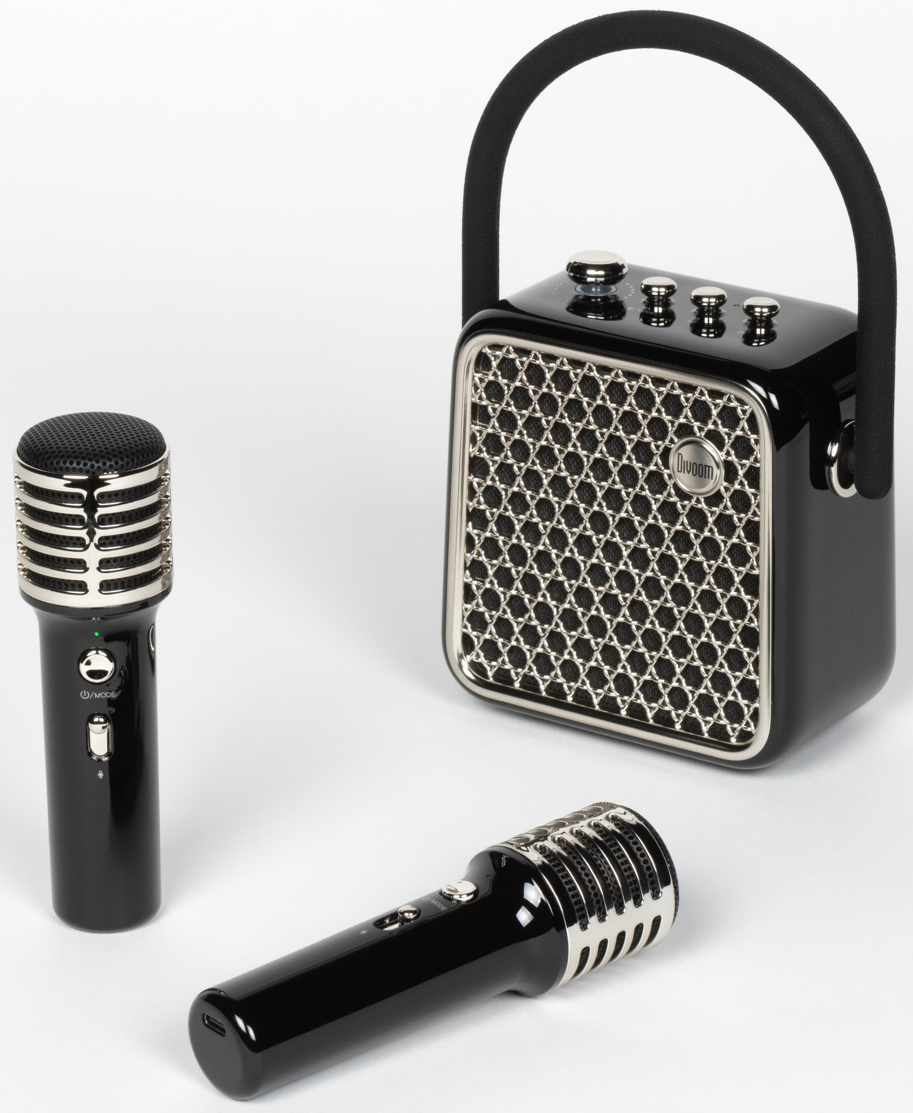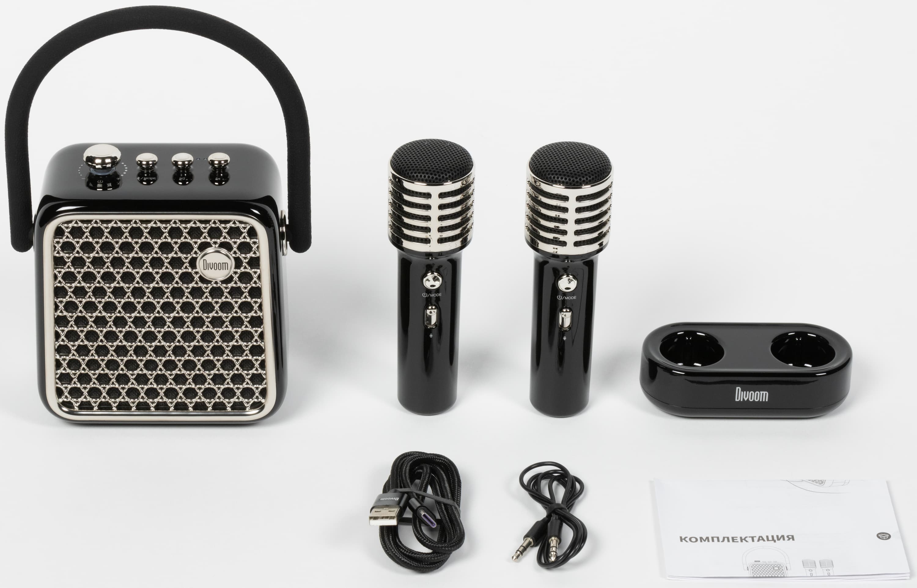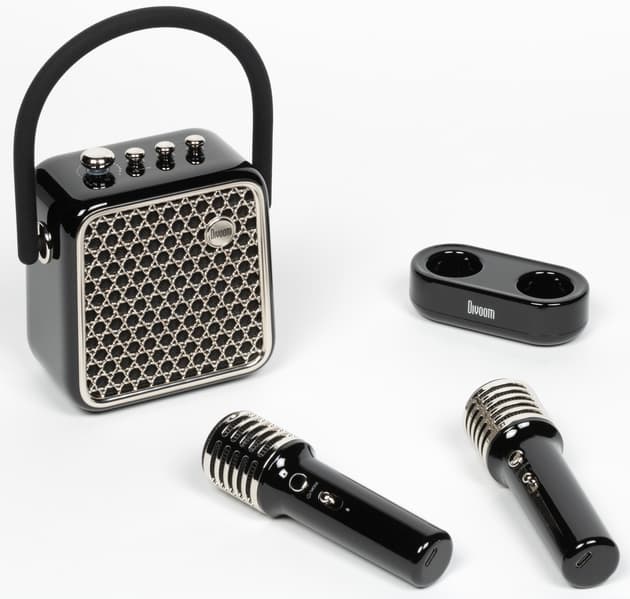 Кейс для переноски можно убрать куда-нибудь в ожидании следующей поездки на вечеринку к друзьям, микрофоны аккуратно разместить в док-станции, колонку поставить рядом — красота. Divoom Songbird-SE предлагается в трех цветах: лавандовом, лимонном и черном. У нас на тестировании был последний вариант.