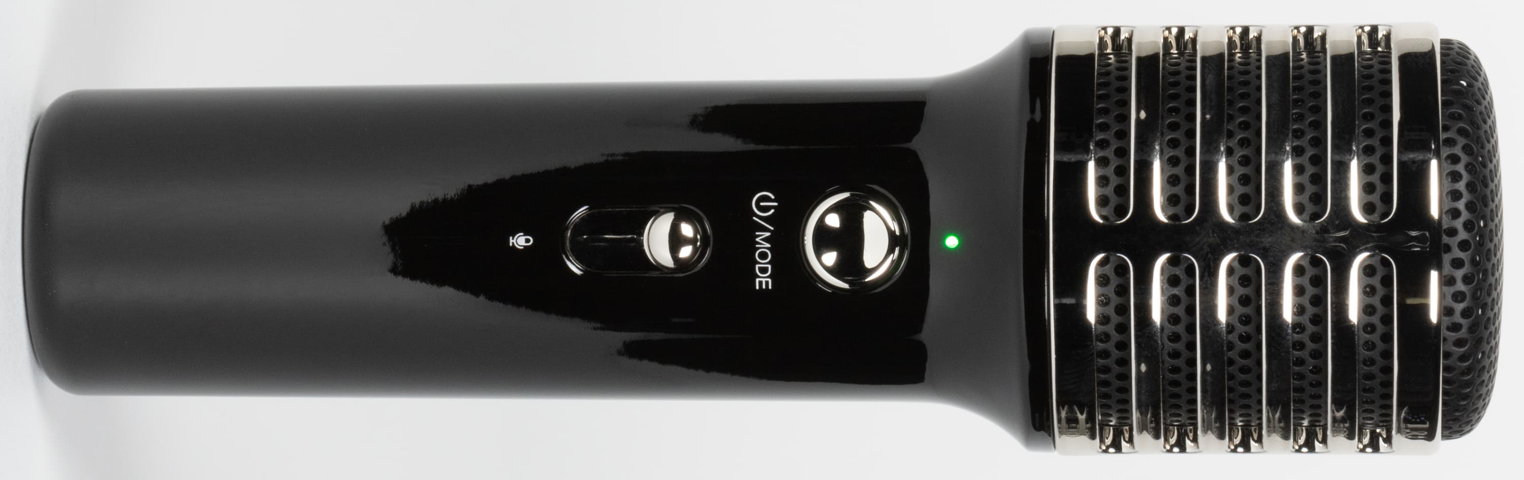 На панели управления микрофоном три элемента: регулятор громкости в виде «ползунка», кнопка питания и выбора режима, светодиодный индикатор. Кнопка нажимается с небольшим усилием и четким кликом, а вот регулятор перемещается слишком легко — крайне велики шансы случайно изменить его положение во время использования микрофона.