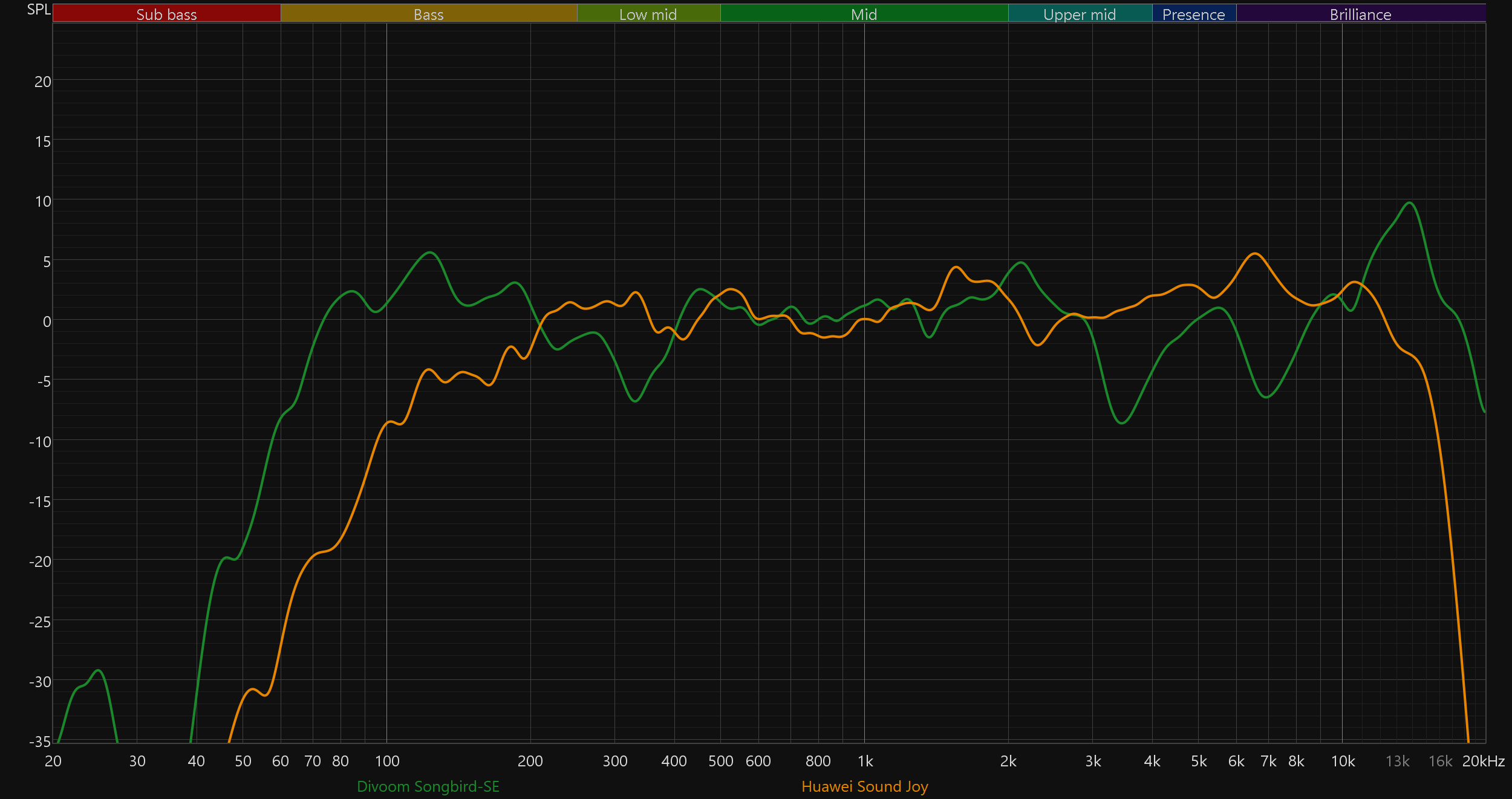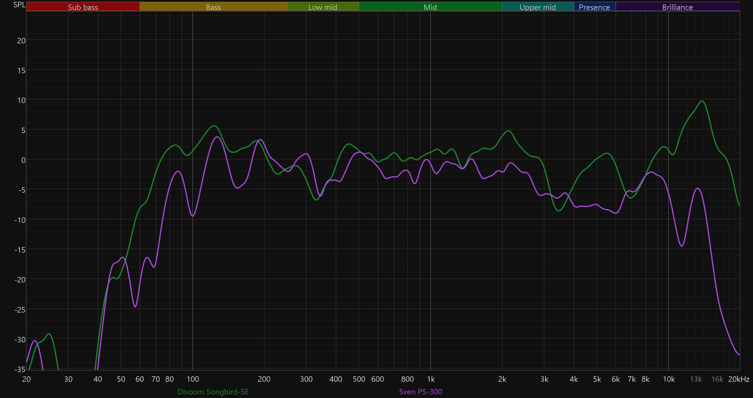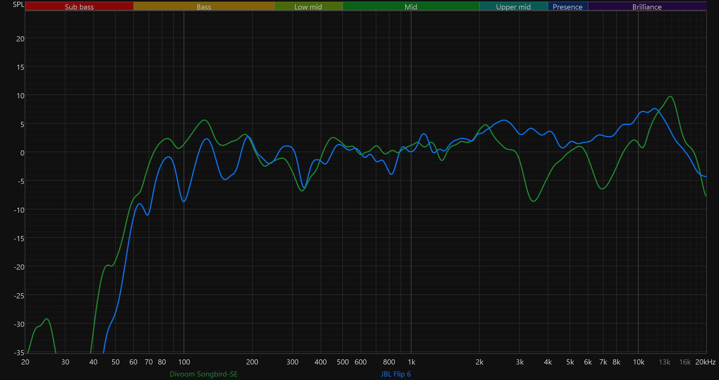 Ну и под конец вернемся к тому, с чего начинали — особенностям звучания портативной акустики с пластиковым корпусом в целом и Divoom Songbird-SE в частности. Сравнение с другими знакомыми нам устройствами Divoom в данном случае не имеет смысла: там и размеры поменьше, и конструкция в силу наличия экрана отличается сильно. При этом колонок с действительно похожей конструкцией в наших тестированиях пока не было, потому подберем устройства с сопоставимой массой и внутренним объемом. Дополнительно комментировать каждый график не будем, просто отметим, что свои особенности есть в звуке всех колонок: какая-то выигрывает в плане «ровности» подачи баса, где-то чуть детальнее звучит середина... Идеал пока не достигнут.