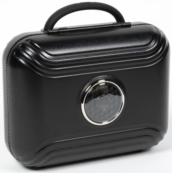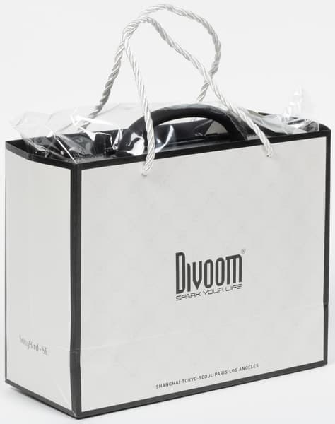 Divoom Songbird-SE поставляется в кейсе для хранения и переноски. Выполнен он из прочного пластика, но внешняя поверхность имеет отделку «под кожу», благодаря чему выглядит очень симпатично. По центру размещен декоративный элемент с логотипом производителя, запирается кейс на металлический замок. Ручка резиновая, не вызывает вопросов касаемо надежности и приятна на ощупь.