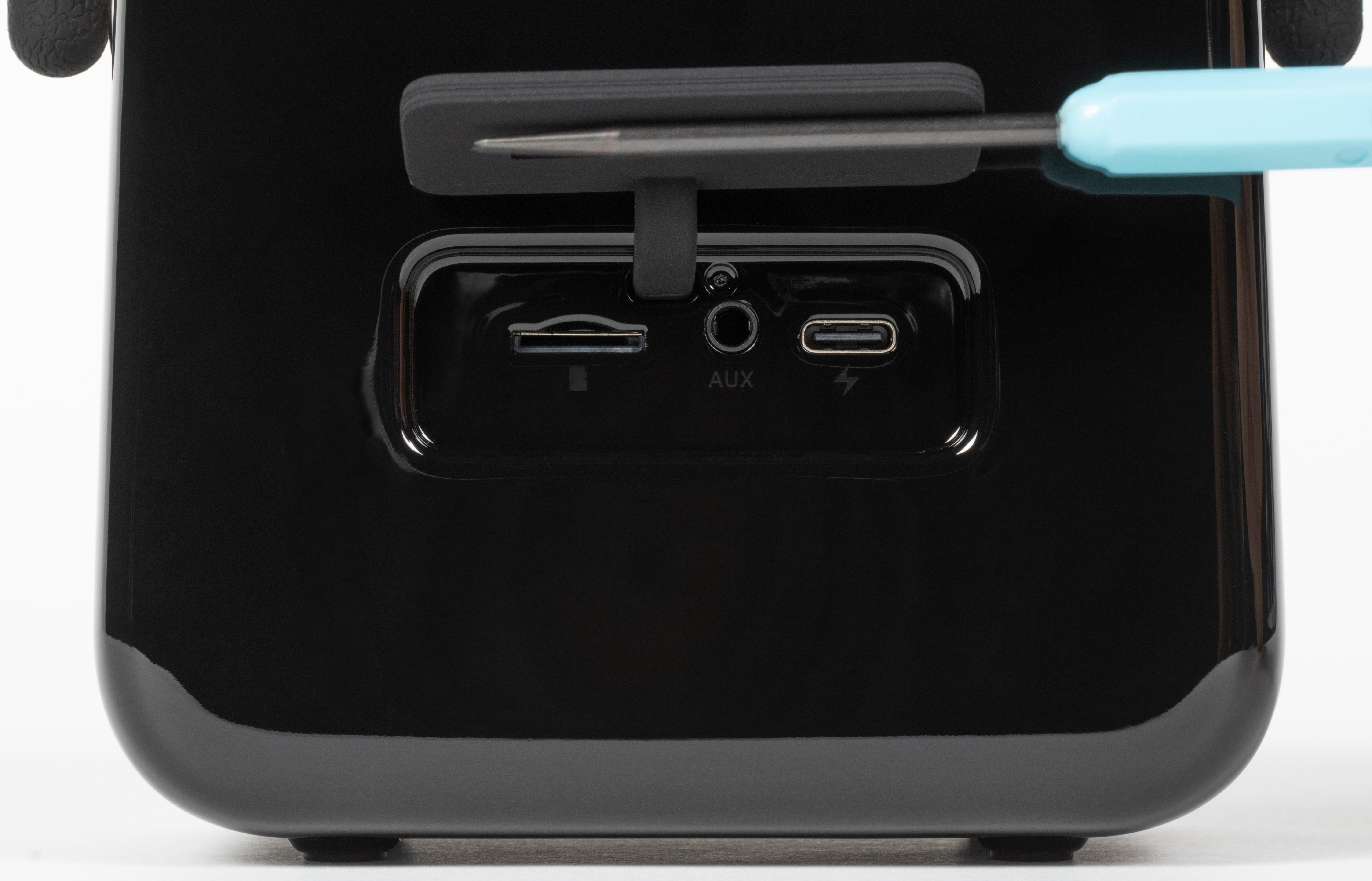 Поддерживаются накопители емкостью до 32 ГБ, при помещении карты в слот устройство автоматически активирует встроенный плеер. Заявлена только поддержка MP3, но в ходе тестирования колонка также воспроизвела файлы в формате WAV. Разъем Aux служит для аналогового подключения к внешним источникам, включается соответствующий режим также автоматически при втыкании коннектора в разъем.