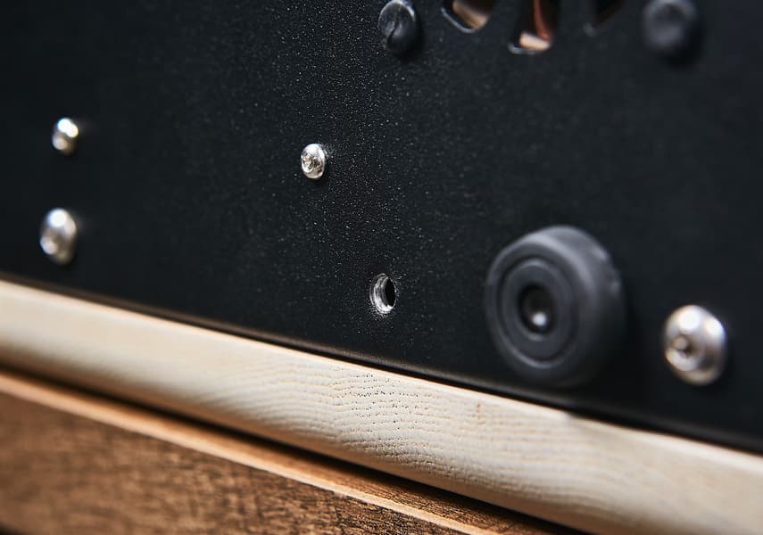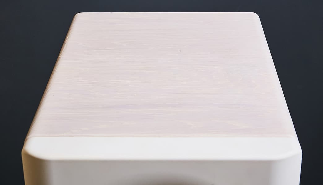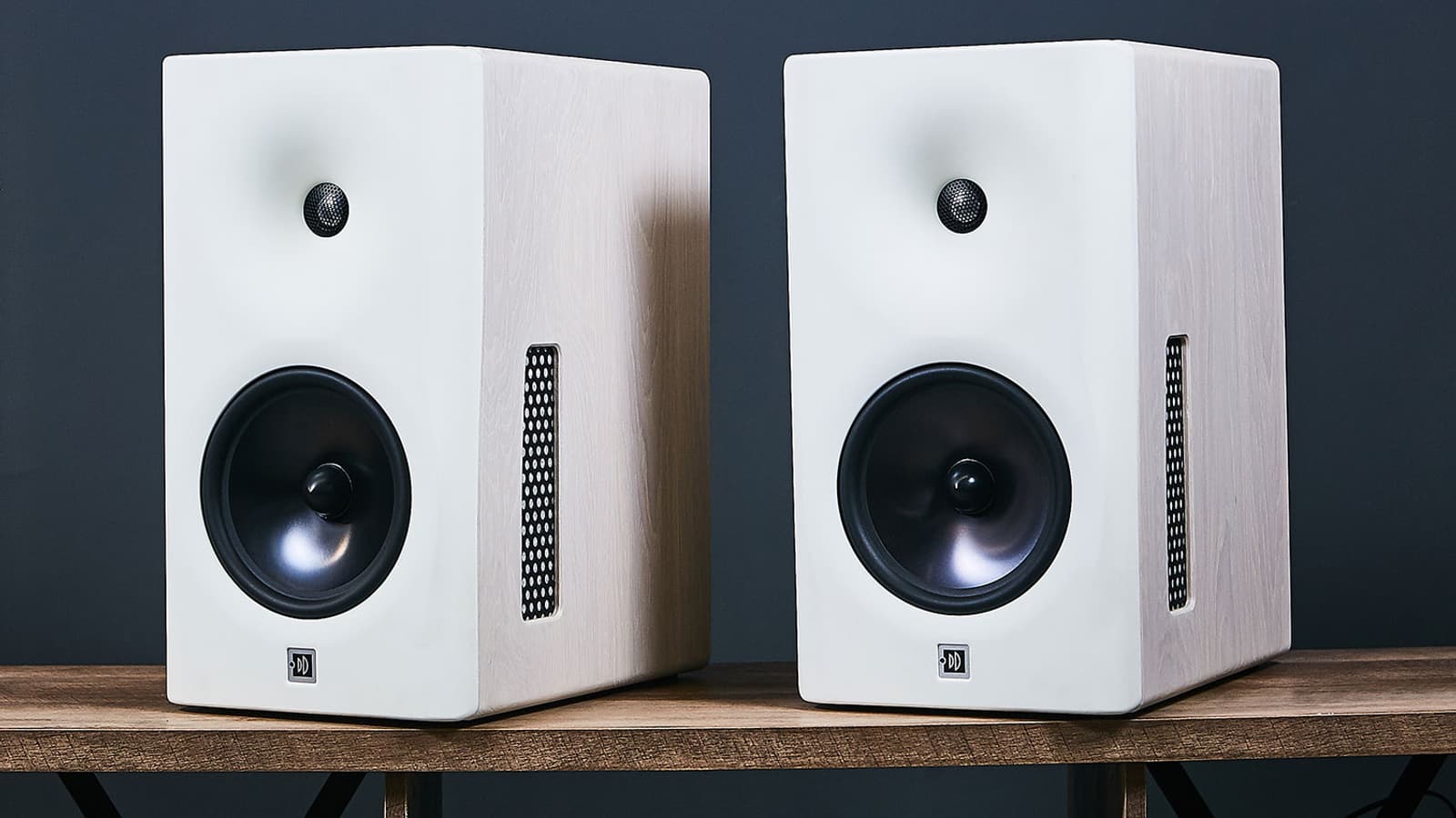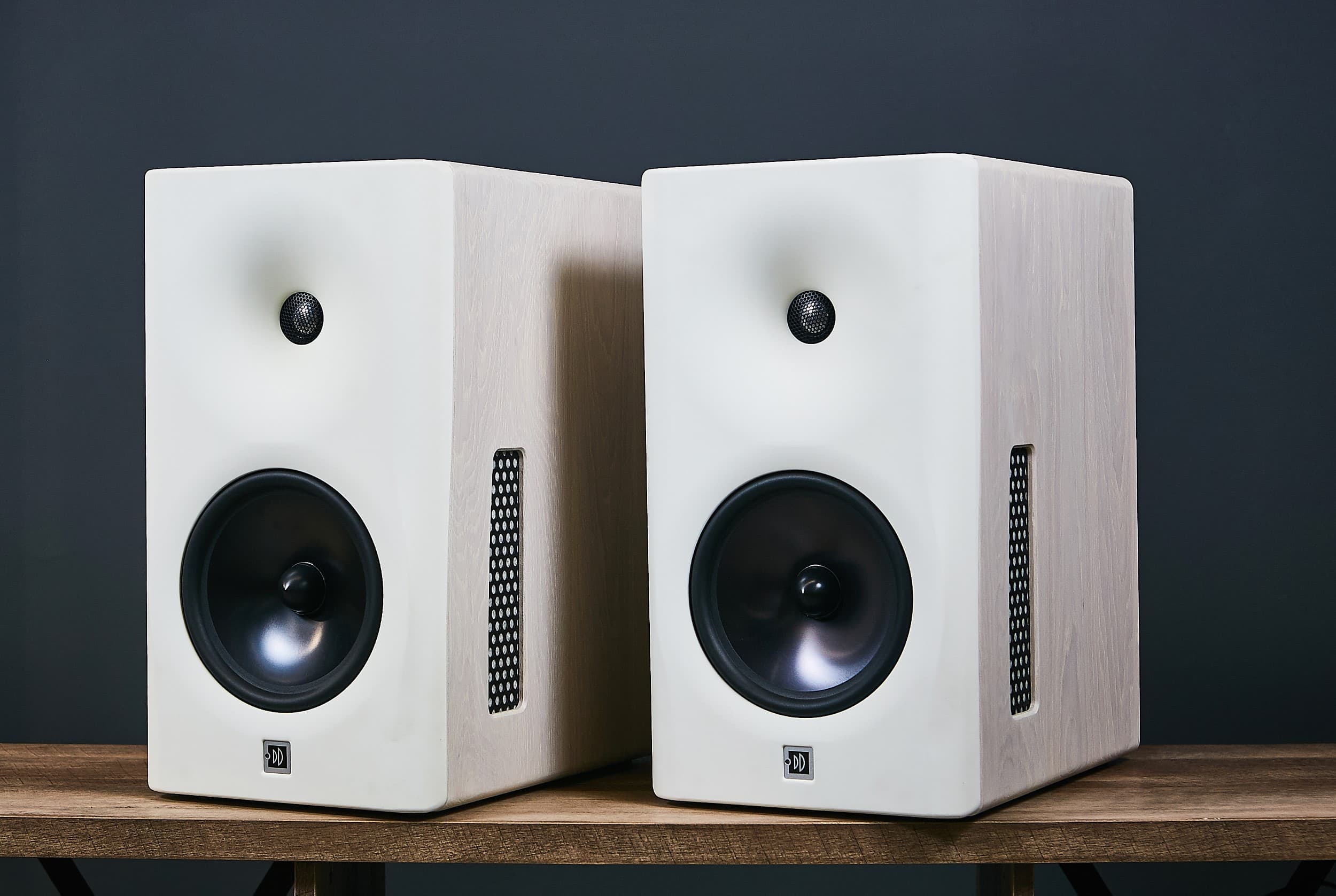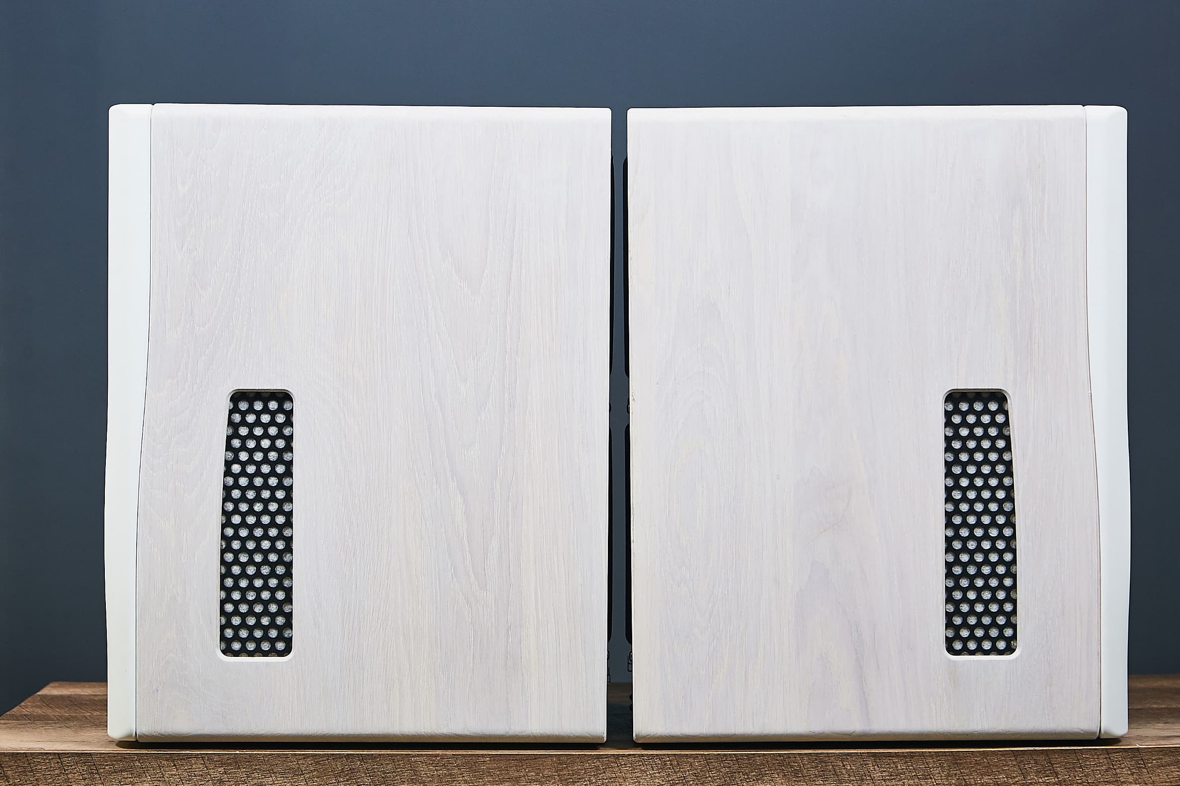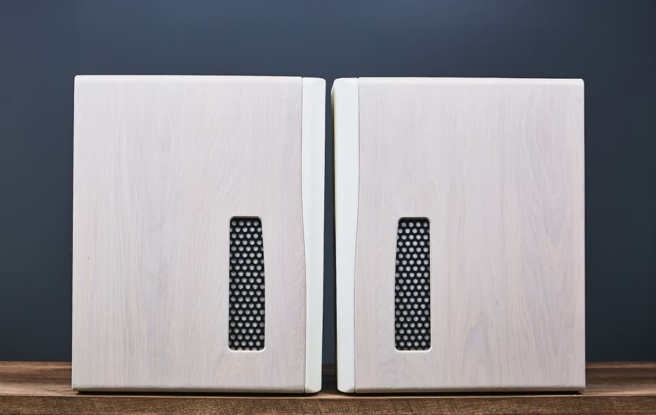 Dutch & Dutch 8c могут быть выполнены в четырех цветовых решениях: белый/натуральный, черный/натуральный, черный/коричневый и черный/черный. Первым в каждой паре указан цвет передней панели из ABS-пластика, вторым — цвет отделки из массива натурального дуба толщиной 19 мм, под которым скрывается 18 мм березовой фанеры. Мы тестировали первый вариант, сочетающий белую панель и дубовую отделку без дополнительной окраски.