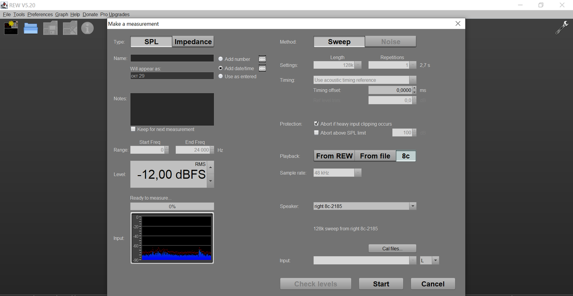 Как уже было отмечено выше, первым делом стоит обеспечить колонки сетевым подключением, без этого просто никуда. А далее нам понадобится широко известная в узких кругах программа Room EQ Wizard, скачать которую можно бесплатно по ссылке с сайта разработчика. Работе с REW можно посвятить отдельную статью, причем не одну, потому остановимся только на ключевых моментах настройки именно Dutch & Dutch 8c. Ну и заметим, что собравшемуся самостоятельно настраивать акустику пользователю стоит быть готовым немного разобраться в том, как и что там измеряется. Время потребуется, но будет очень интересно и полезно.