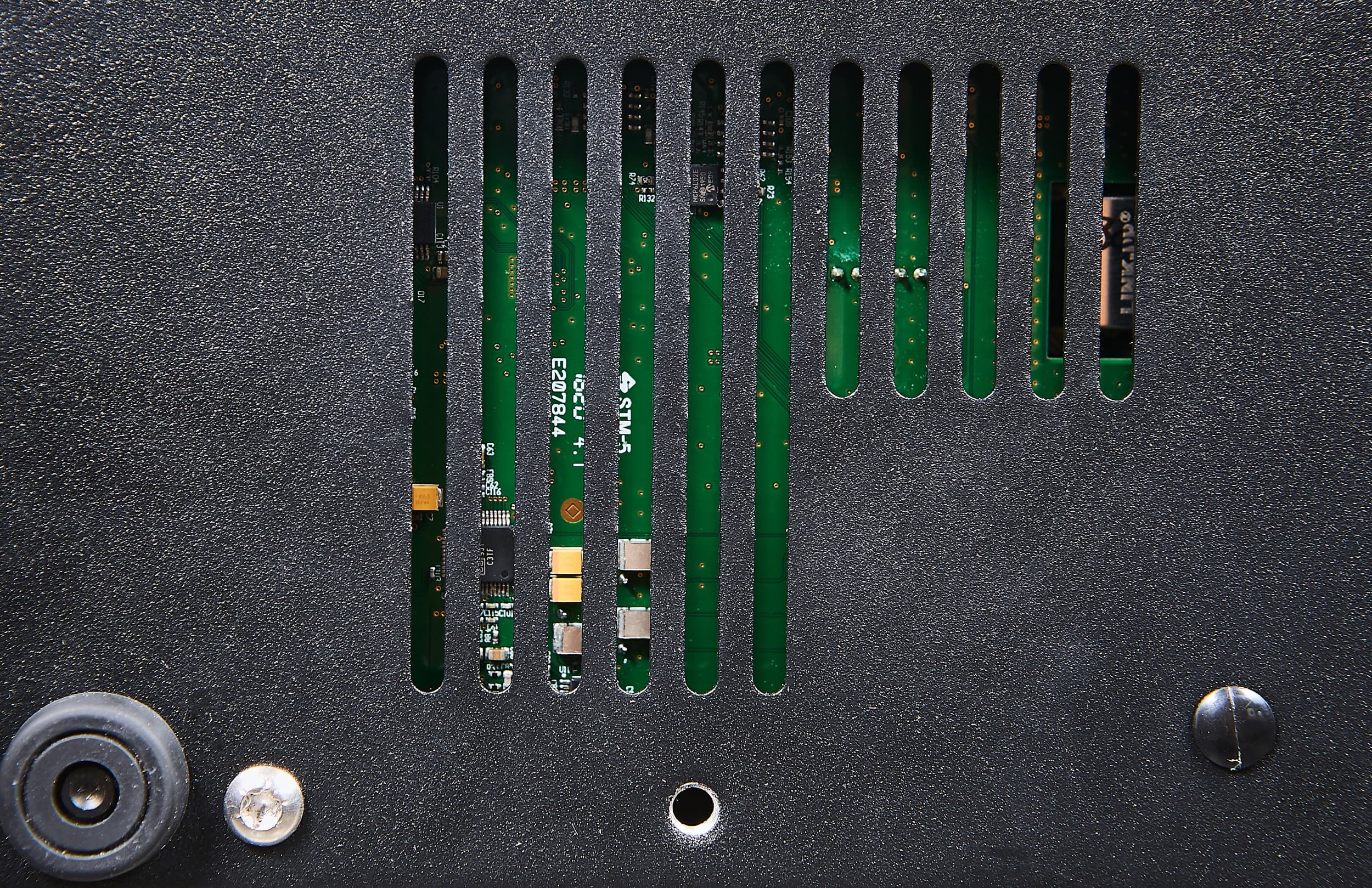 В левой части находятся воздухозаборные отверстия, сквозь которые виден операционный усилитель Microchip MCP6L02E.
