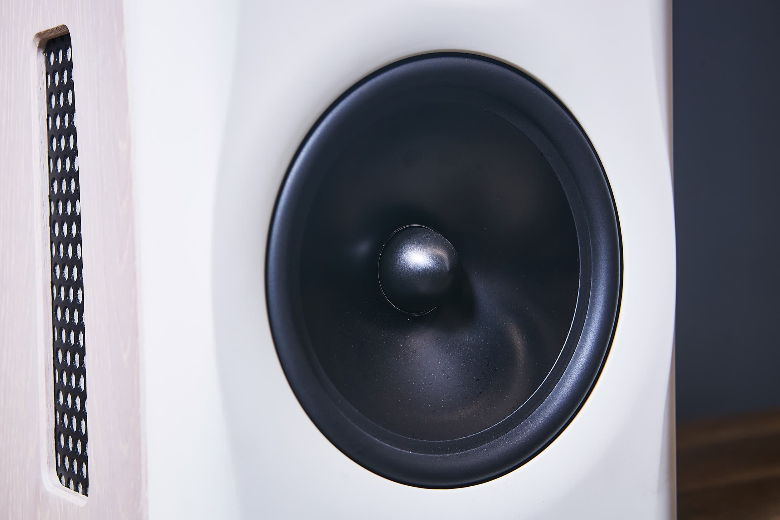 В нижней половине передней панели размещен мидбасовый динамик диаметром 200 мм с алюминиевым диффузором и «фазовыравнивающим» пылезащитным колпачком пулевидной формы.