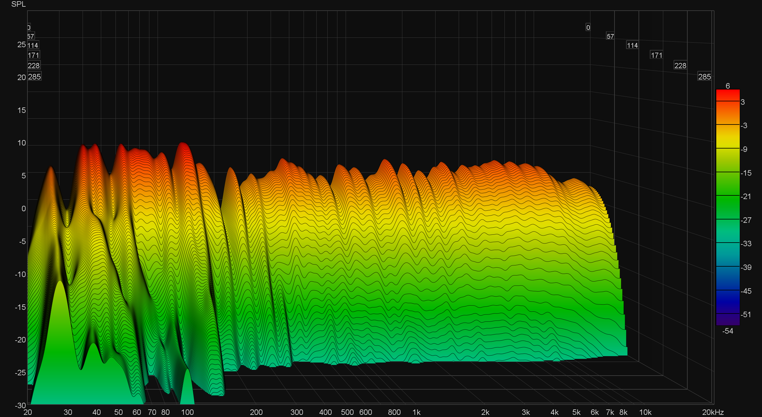 Первое, на что стоит обратить внимание — это, конечно, весьма «ровные» средне- и высокочастотный диапазоны. Конечно, своеобразные изгибы имеются — колонки, как мы уже говорили, не без собственного характера. Но все же очень неплохо и «мониторно». А вот в низкочастотном диапазоне происходит интересное — есть явные пики и провалы. И вот тут, конечно, велик вклад помещения, в котором мы производили замеры. Что прекрасно видно по графику кумулятивного затухания спектра (он же «водопад» или waterfall).
