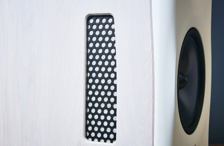 На боковых панелях Dutch & Dutch 8c находятся крупные прямоугольные порты, которые являются одной из самых интересных отличительных черт акустики. По замыслу разработчиков, эта особенность конструкции должна обеспечить кардиоидную диаграмму направленности звучания колонок на частотах от 100 Гц.