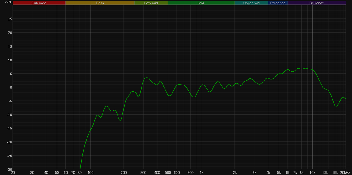 Как уже упоминалось выше, компактные размеры не могли не сказаться на звучании колонки. При этом звучит она куда интереснее, чем можно было бы предположить, посмотрев на габариты. Во-первых, громкости ее достаточно, чтобы озвучить небольшую комнату. А во-вторых, она способна воспроизводить НЧ-диапазон, что хорошо видно по графику АЧХ ниже. Как и заявлено производителем, звучание стартует где-то от 100 Гц. При этом середина подается более-менее равномерно и остается вполне читаемой, ну и заявленный верхний порог в 15 кГц тоже выдержан. Но тут надо отметить, что максимально эффективно два драйвера колонки работают в диапазоне где-то от 300 Гц до 10 кГц.