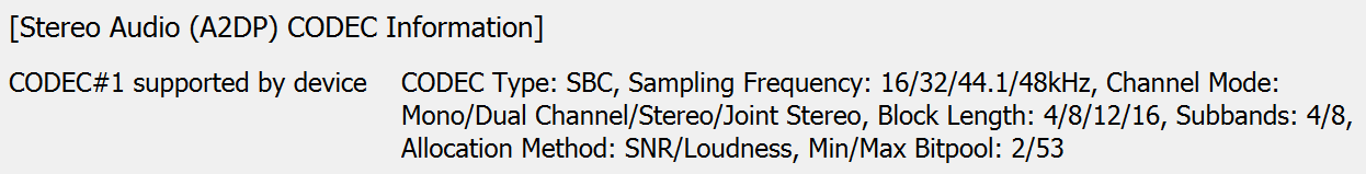 Список кодеков и их режимов мы традиционно получили с помощью утилиты Bluetooth Tweaker. Кодек всего один — базовый SBC, для маленькой стограммовой колонки его возможностей явно будет достаточно. Мультипойнт не поддерживается, но в данном случае он и не особо нужен.