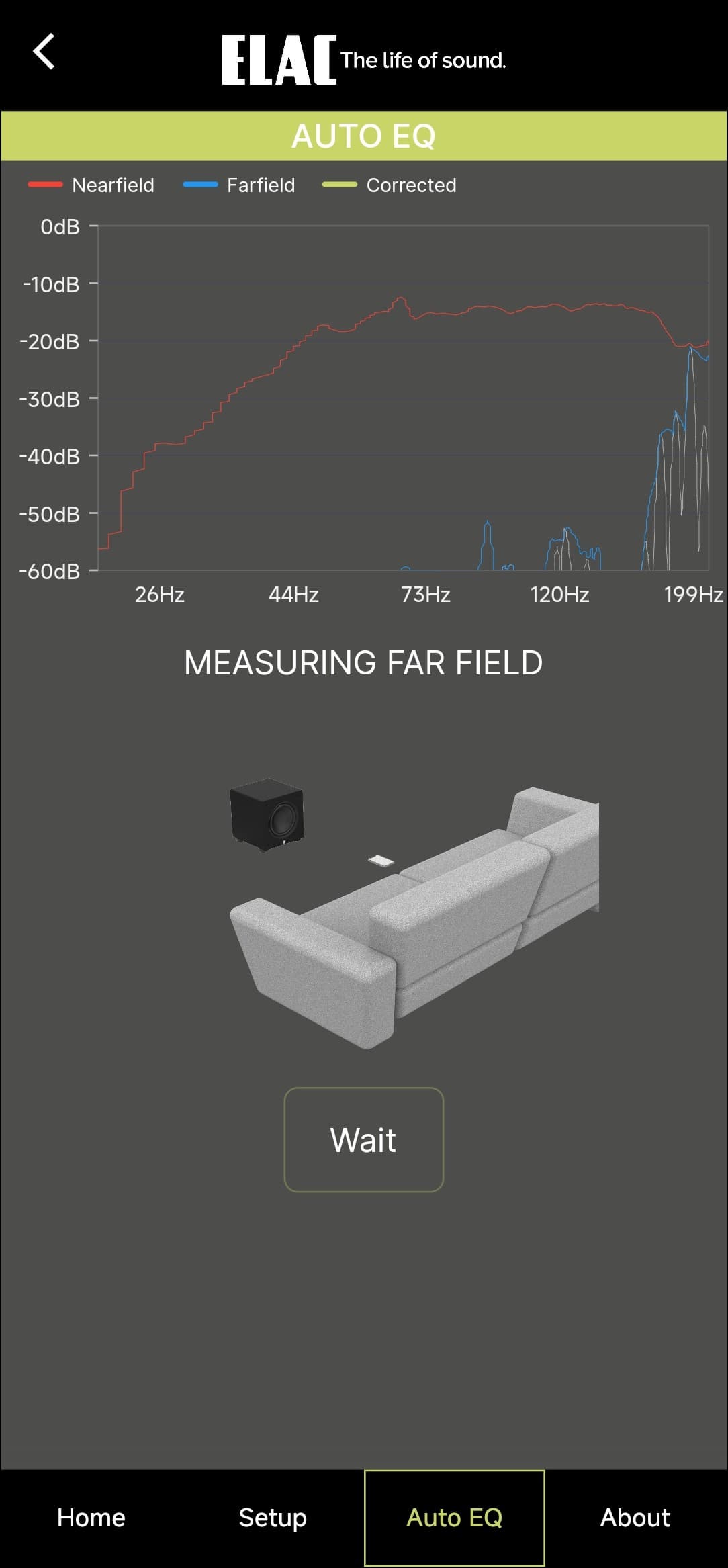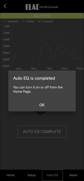 Но главный хит приложения — это, конечно, система автоматической калибровки под помещение. Для настройки используется микрофон гаджета, на который установлено ПО. Для начала система просит поднести его непосредственно к сабвуферу, после чего проводит измерения, транслируя в динамик тестовый сигнал. Далее необходимо переместить гаджет в точку прослушивания.