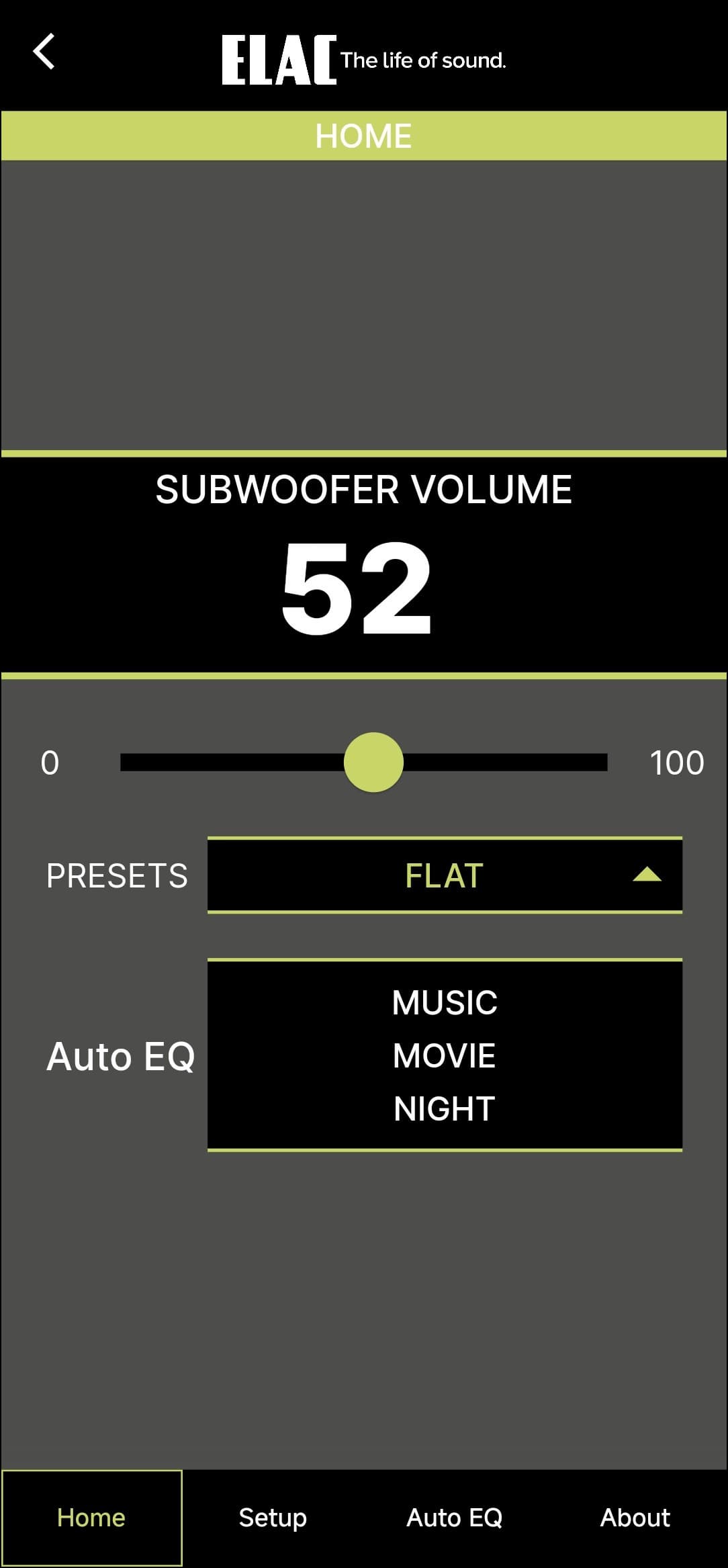Устанавливаем ПО, даем необходимые разрешения. После включения питания сабвуфер появляется в списке доступных автоматически — без дополнительных действий со стороны пользователя. На основном экране устройства можно регулировать его громкость, включать и выключать автоматическую эквализацию, а также выбирать один из предустановленных профилей звучания.