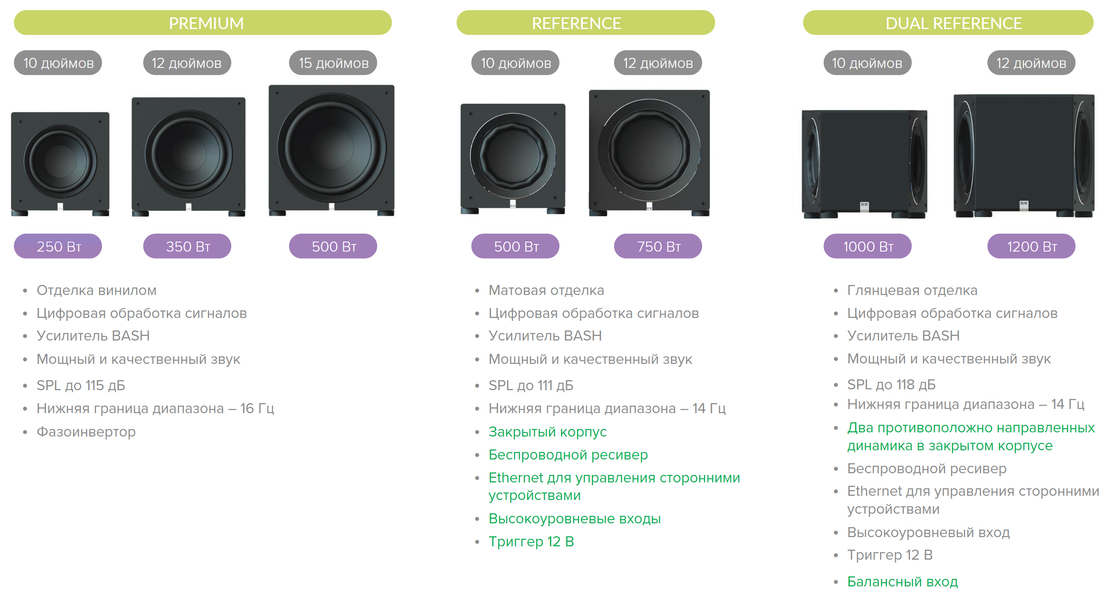Всего в семейство Varro вошли семь устройств в трех линейках. Самая «младшая» называется Premium — видимо, это непрозрачный намек на то, что не премиальных продуктов тут просто нет. В нее вошли три модели с фазоинвертором: PS250-BK, PS350-BK и PS500-BK, отличающиеся габаритами и мощностью встроенного усилителя. В серию Reference входят две модели с корпусом формата «закрытый ящик» RS500-B и RS700-B. Ну а самый «топовый» вариант семейства — две модели серии Dual Reference: DS1000-GB и DS1200-GB, оснащенные сразу парой НЧ-динамиков.