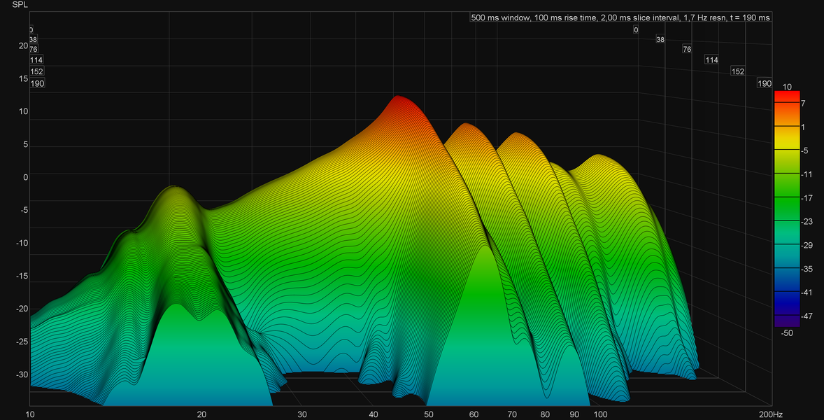 Заявлено, что звучать сабвуфер начинает от 15 Гц — где-то так и получается, но полной эффективности он достигает примерно к 45 Гц. На графике кумулятивного затухания спектра (он же «водопад» или waterfall) хорошо видны пики, показывающие нам «гудение» в районе 20 и 65 Гц. Частично этот эффект может быть вызван внутренними резонансами корпуса, возникающими даже вопреки действительно хорошему акустическому демпфированию. Ну а вот вторым пиком мы с большой долей вероятности обязаны не самому удачному размещению.