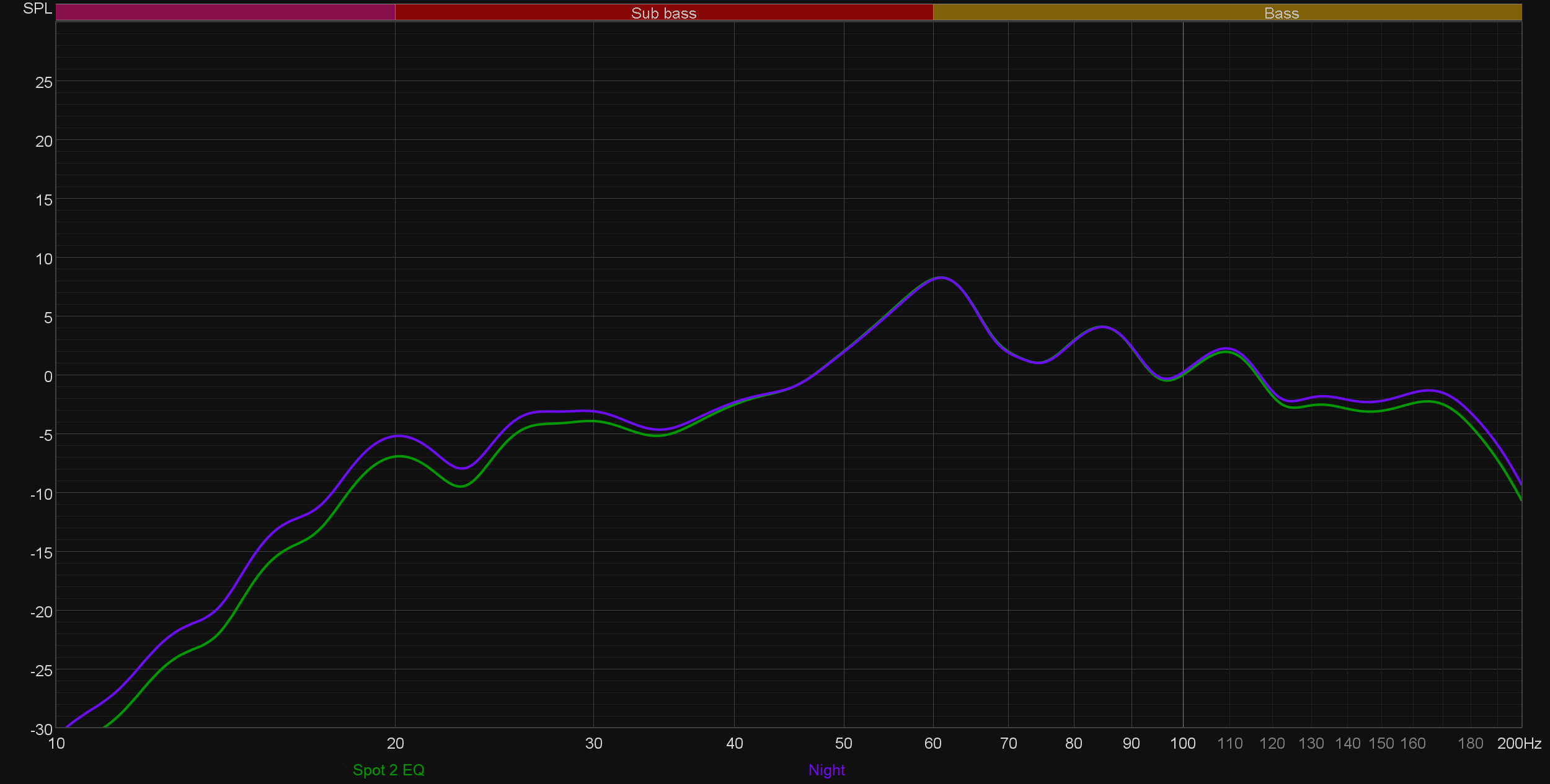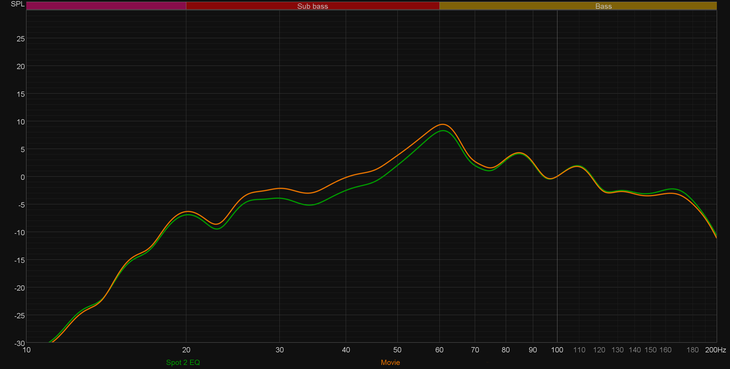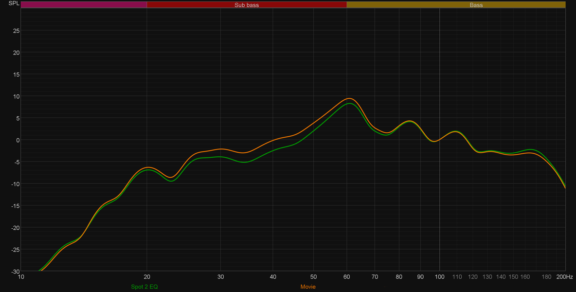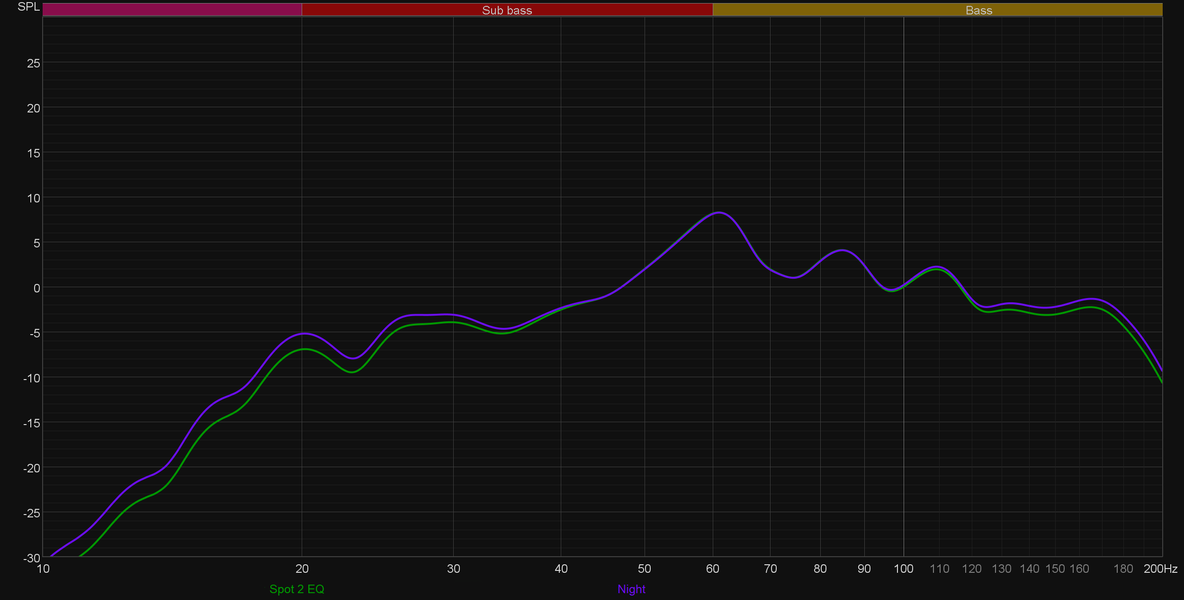 В итоге мы, конечно же, подыскали сабвуферу более правильное положение, получив сходную с первым графиком картину, но уже в точке прослушивания. Настало время посмотреть, что делают предустановленные профили звучания.