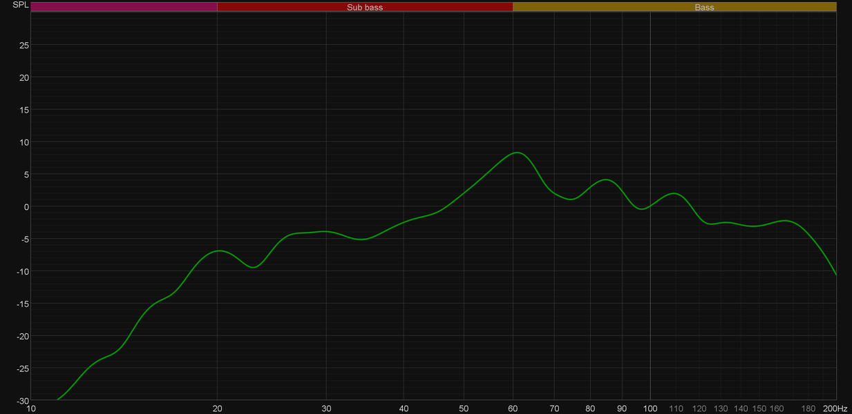 И раз автокоррекция под помещение у Varro Reference RS500, было бы странно ею не пользоваться. Потому сабвуфер мы разместили в акустически подготовленной комнате, но в далеко не в самом удачном месте, руководствуясь больше удобством, чем возможным звучанием. После чего провели первую серию измерений АЧХ, разместив измерительный микрофон в 60 см на оси динамика. Кроссовер выключаем, чтобы посмотреть на максимальный воспроизводимый диапазон.