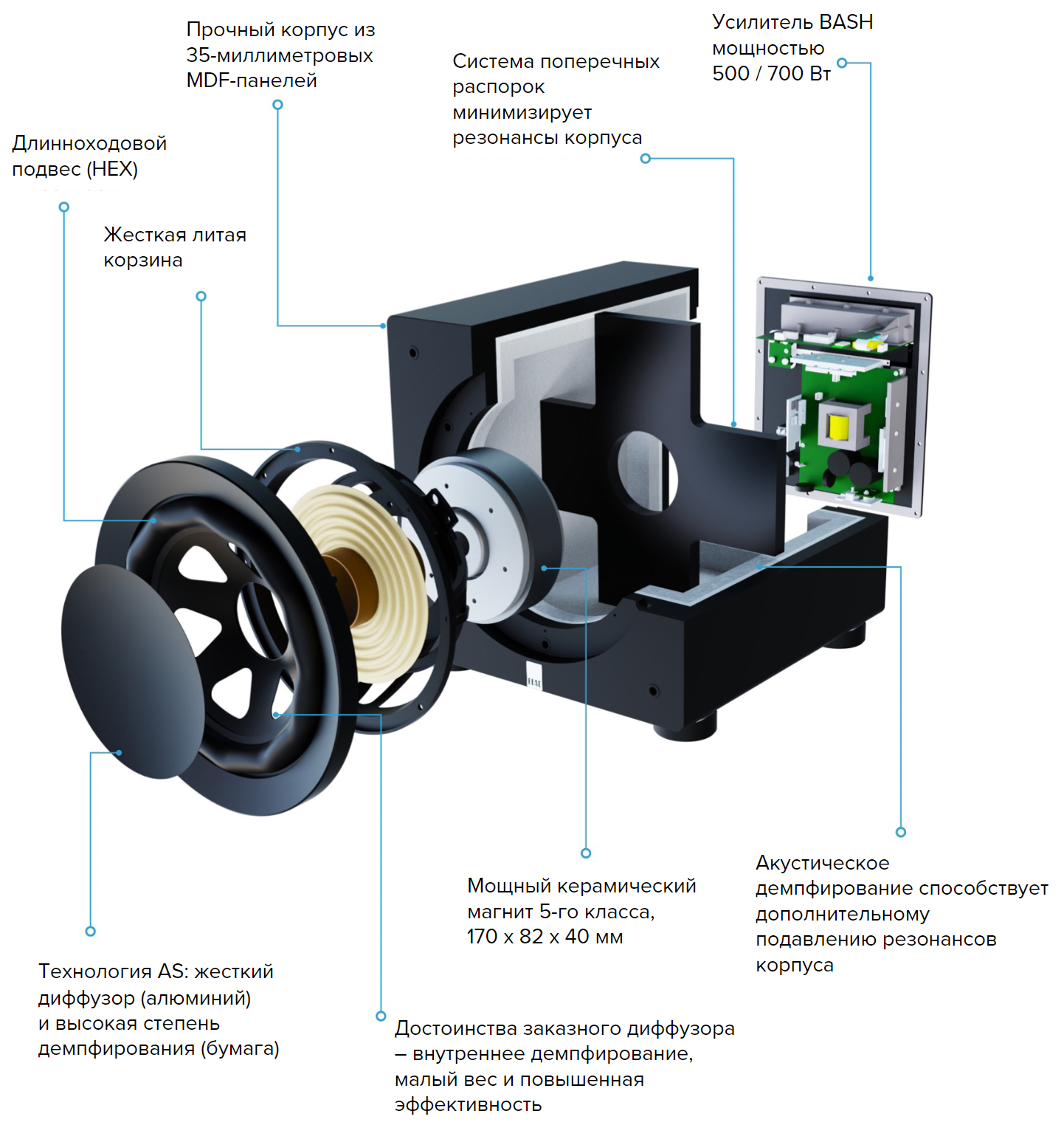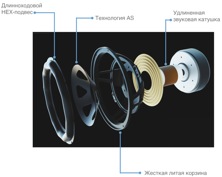 Примечателен и HEX-подвес диафрагмы, разработанный специально для динамиков с большой массой подвижной системы. Его задача — минимизировать искажения вследствие отклонения от поршневого режима, обеспечив увеличенный ход с траекторией движения точно по оси. Из-за увеличения хода потребовались удлиненные звуковые катушки, за прочность и жесткость конструкции отвечает литая корзина.
