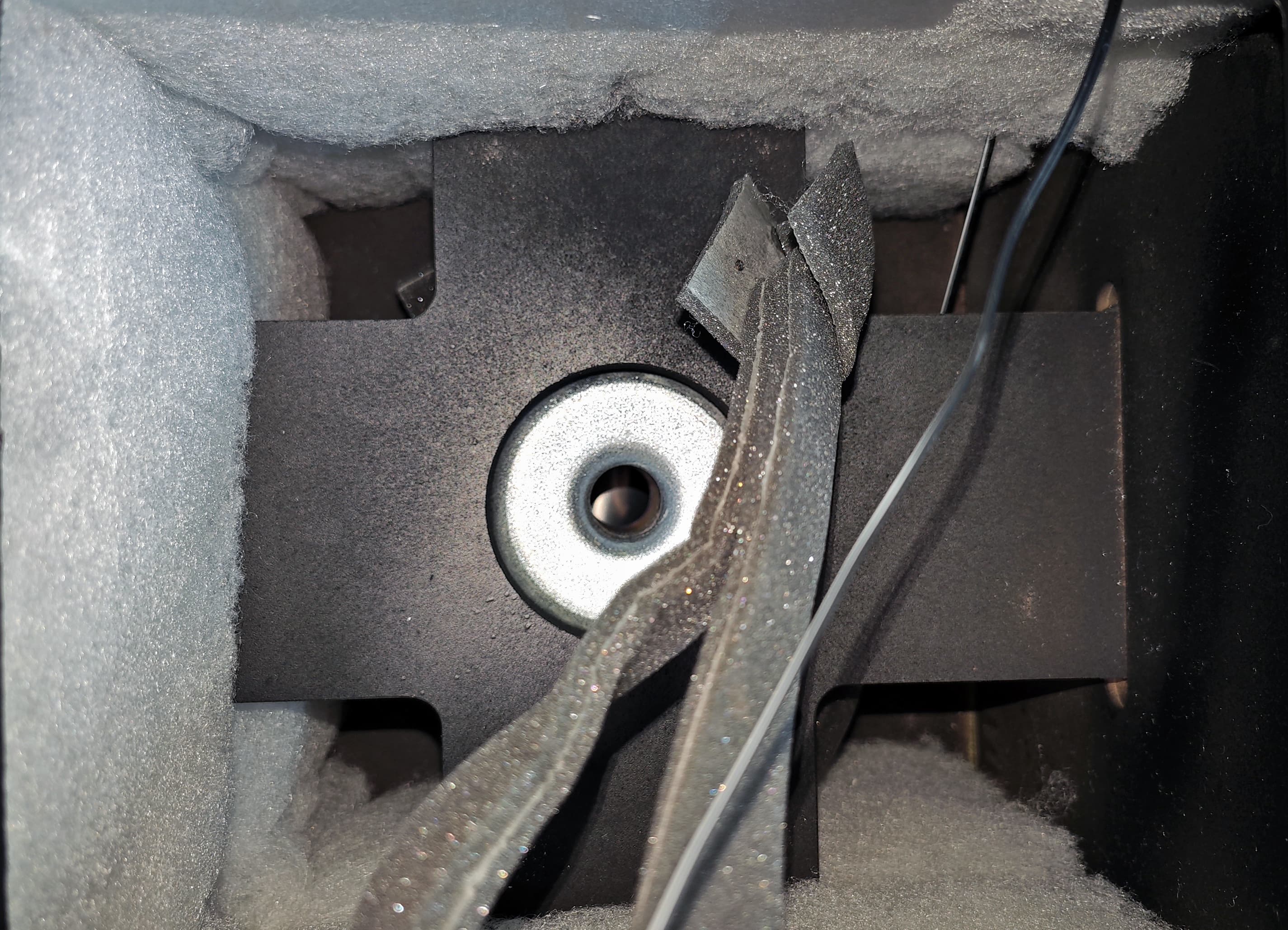 Наличие схемы, конечно же, не удержало нас от того, чтобы заглянуть внутрь корпуса. Снимаем заднюю панель и видим, что все на месте — и распорки, и синтепон в качестве демпфирующего материала.