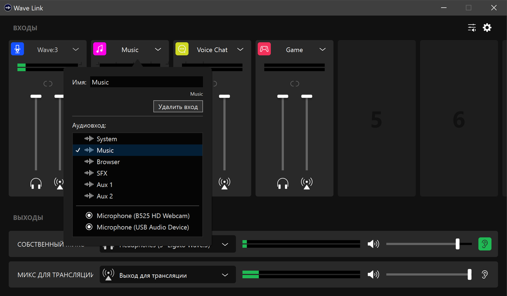 В конце настройки можно навести полный порядок и переименовать все добавленные источники звука, что мы и сделали. Позволяющее сделать это меню раскрывается по клику на стрелочку справа от названия. В том же меню можно удалить вход или выбрать другой источник, причем не только виртуальный — также доступны и другие имеющиеся в системе микрофоны, что удобно. А вот с двумя микрофонами серии Wave программа пока работать не умеет.