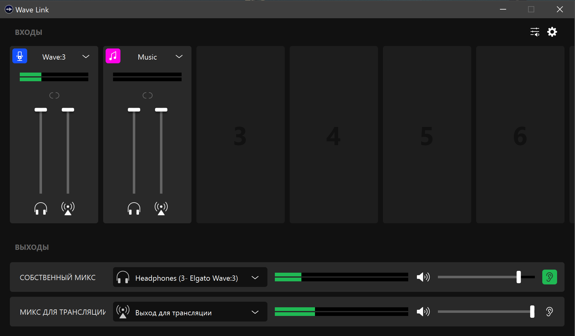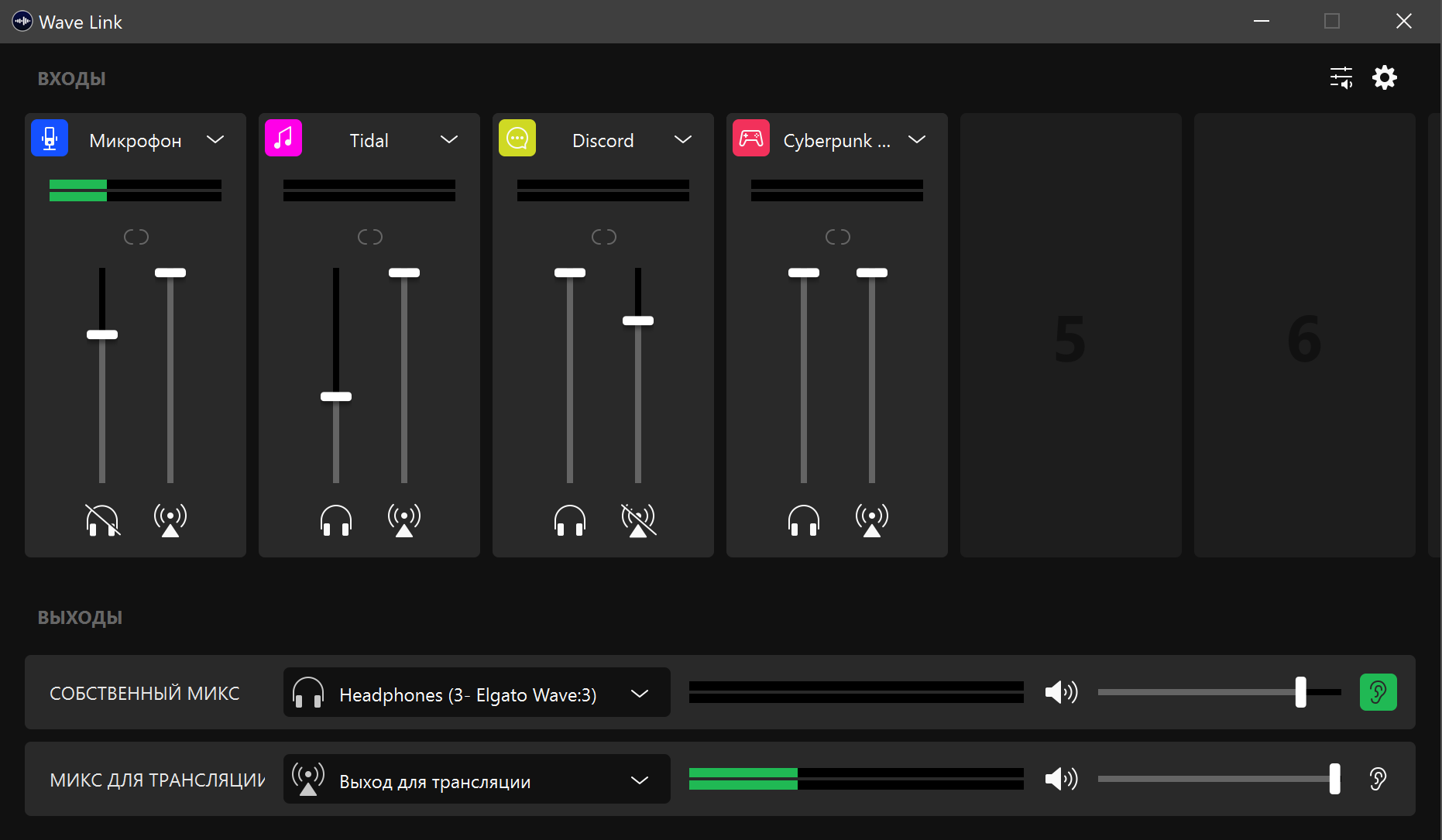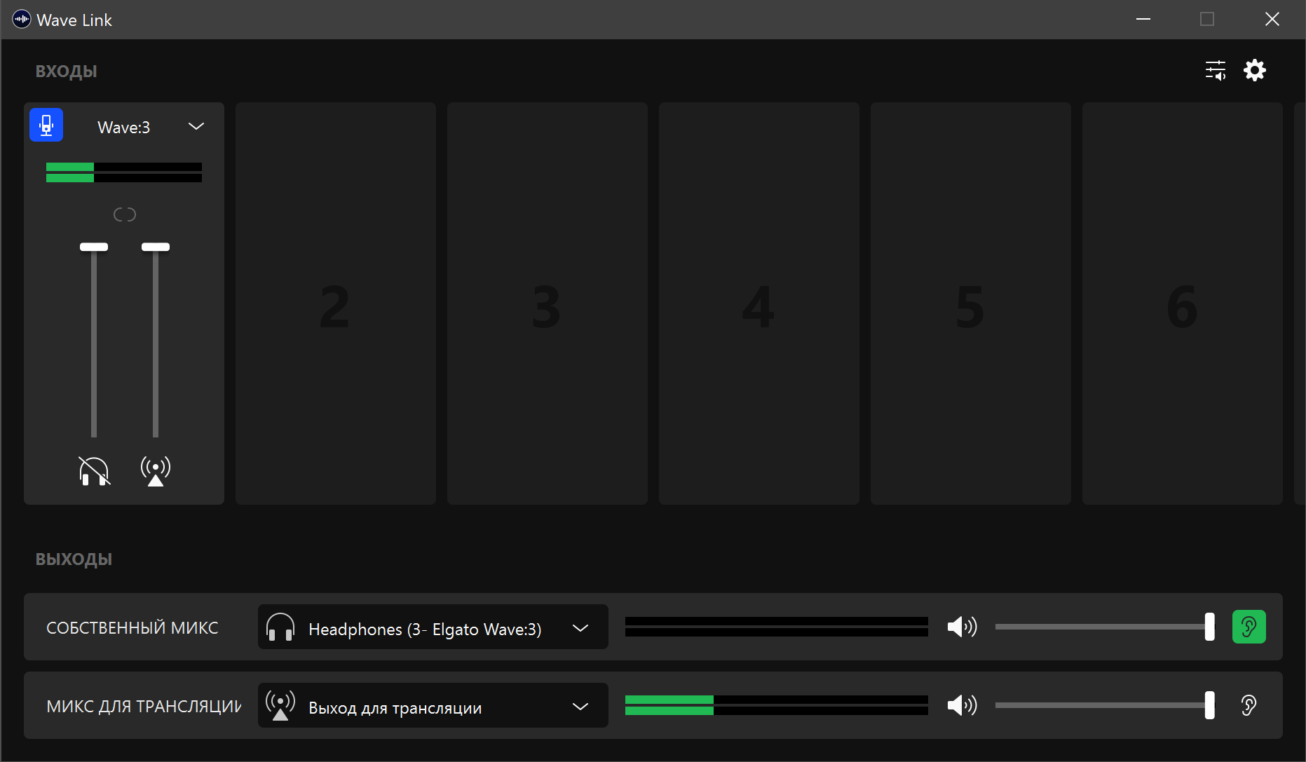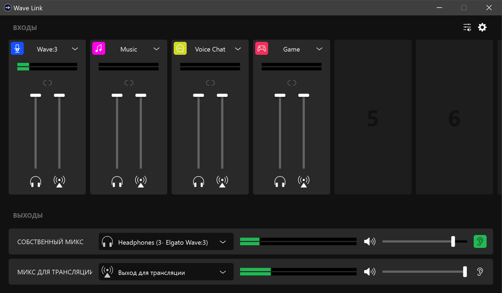 Вернемся на главное окно и еще раз посмотрим, какие возможности у нас теперь появились. В нижней части мы видим выходы для мониторинга и трансляции, громкость которых настраивается раздельно. Кликая по иконкам с ухом, расположенным в правом нижнем углу, можно отправлять себе в наушники для мониторинга либо собственный микс, либо идущий в трансляцию. Ну а выше у нас все источники звука с собственными регуляторами громкости в канале для трансляции и мониторах, клик по иконке внизу виртуального фейдера позволяет быстро выключить звук.