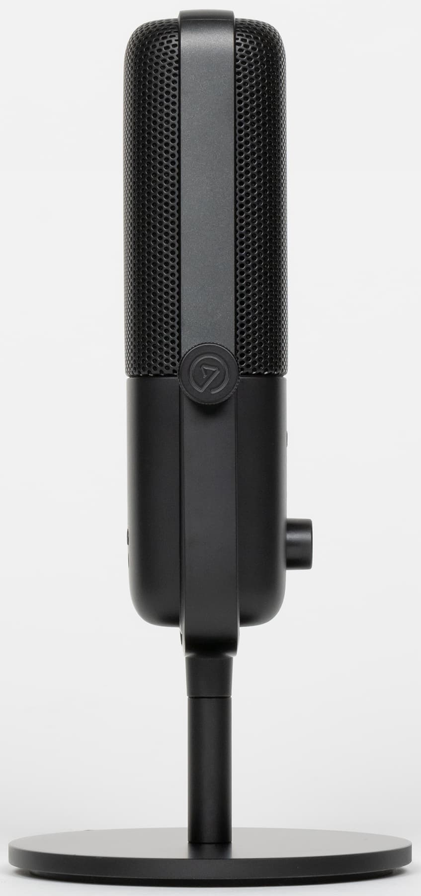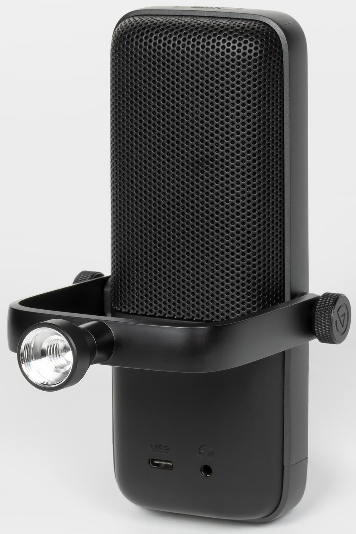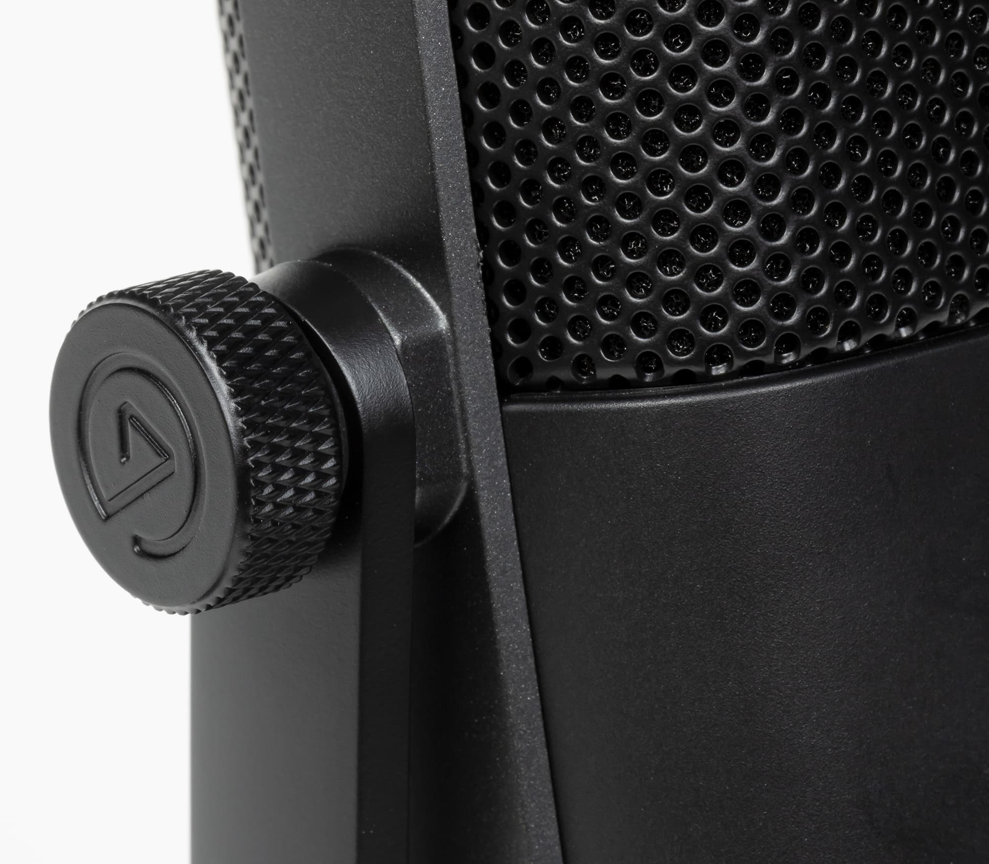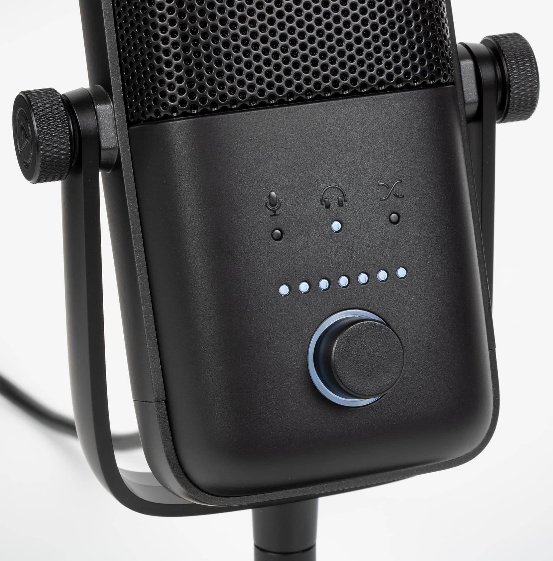 В нижней части лицевой панели расположен поворотный регулятор — валкодер с дискретным ходом без ограничений по углу вращения. Изменять он может три различных параметра: громкость микрофона, громкость в наушниках для мониторинга и баланс между звуком ПК и микрофона в мониторах. Переключаются функции с помощью нажатия на регулятор, активная подсвечивается белым светодиодным индикатором. Полоса светодиодов ниже демонстрирует выбранный уровень активного параметра.