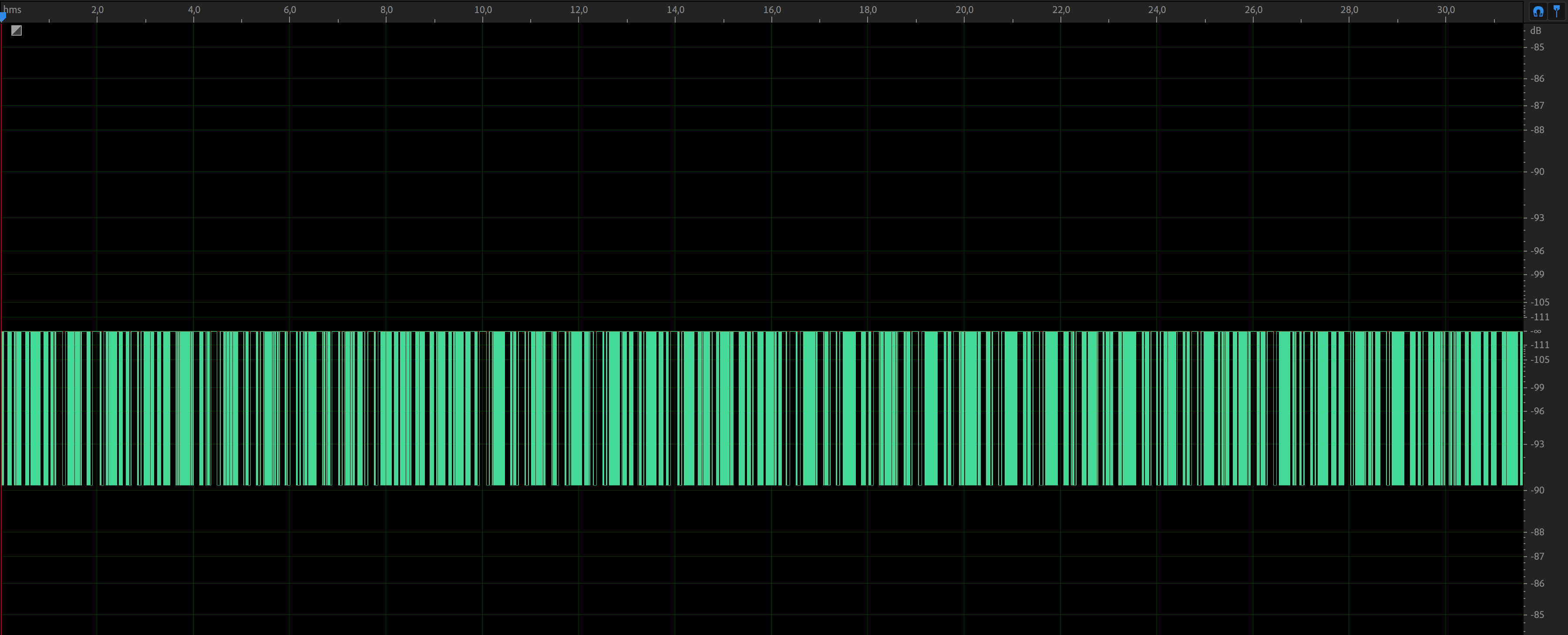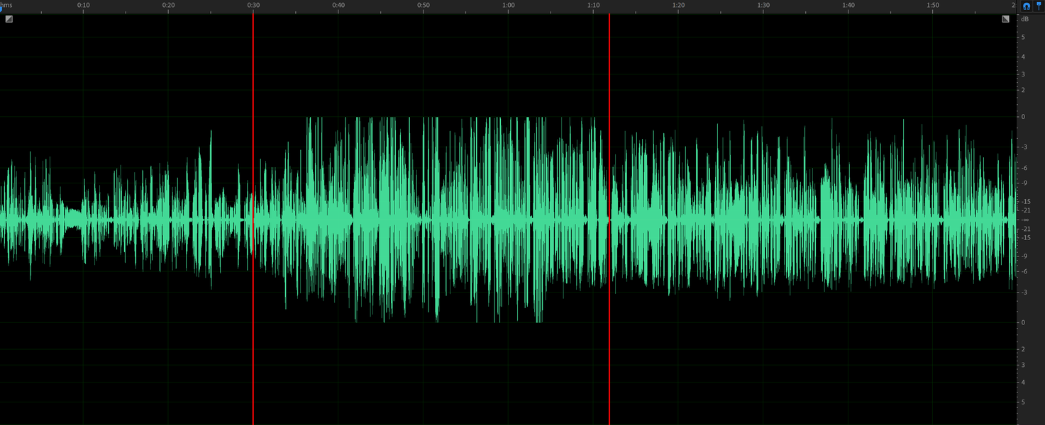 После 30 секунды записи начнем поднимать громкость воспроизведения, добившись в итоге стабильного клиппинга. После этого примерно через 1 минуту 10 секунд записи включим Clipguard — хорошо видно, что пики подбираются к критическим значениям, но клиппинга при этом нет. Все максимально наглядно — система корректно работает.