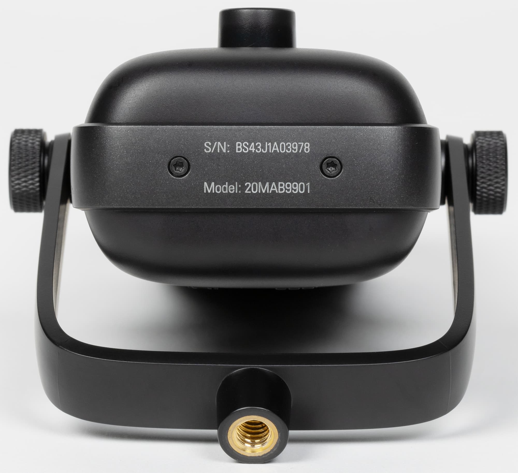 Как уже говорилось выше, комплектная стойка снимается, оставляя U-образное крепление с резьбой ⅝ дюйма. Параллельно посмотрим на нижнюю часть микрофона, где размещены серийный номер и буквенно-цифровой код модели.