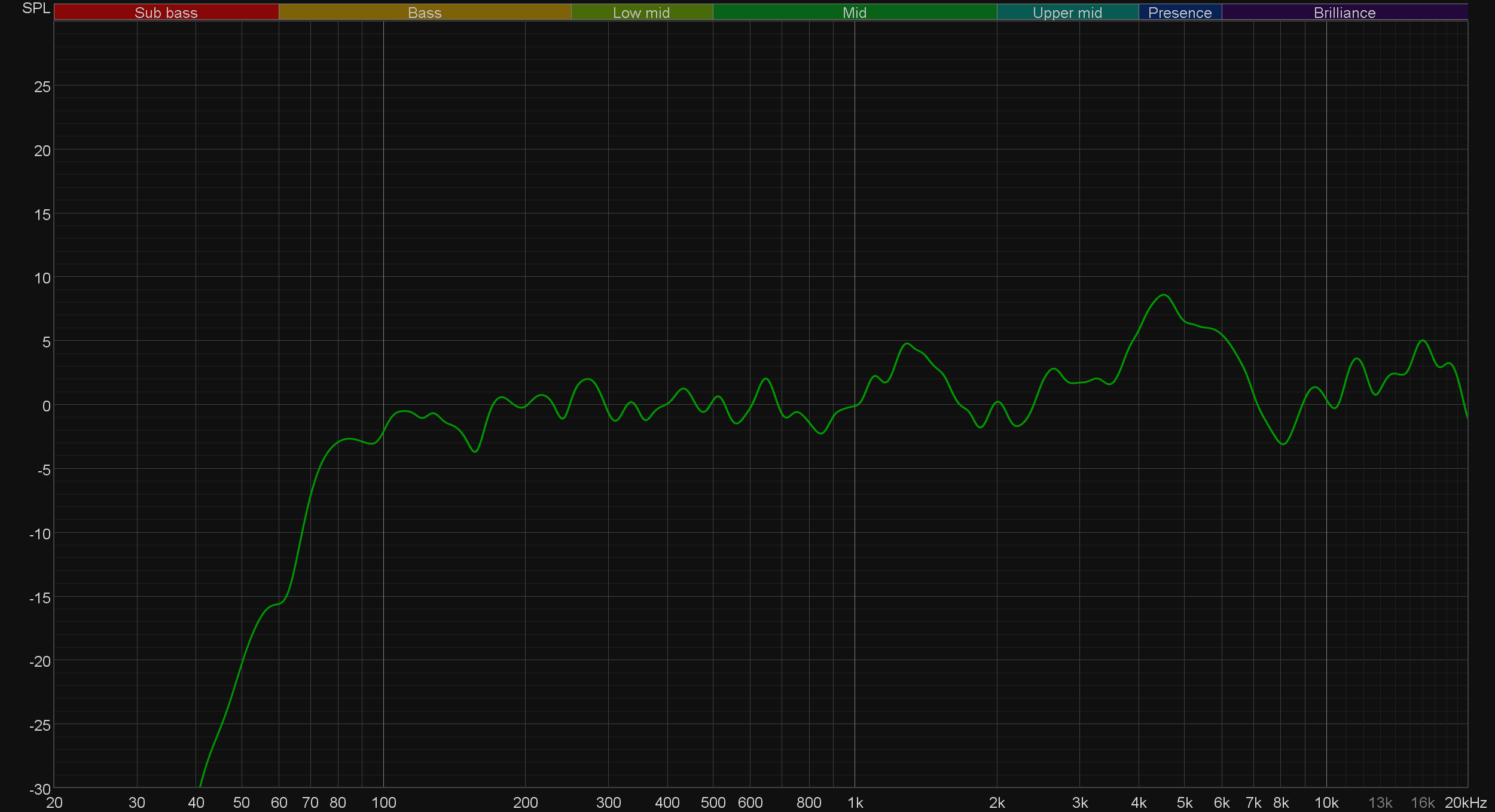 Видно, что Elgato Wave 3 полностью игнорирует область «глубокого баса», что для рассчитанного на запись речи устройства вполне понятно и правильно — даже мужской бас не опускается ниже 80 Гц. Практический весь НЧ- и СЧ-диапазон, где расположены фундаментальные частоты как мужских, так и женских голосов подается довольно ровно, явный «всплеск» между 3 и 6 кГц призван увеличить разборчивость. А частоты в районе 8 кГц, традиционно считающиеся ответственными за проблемы с сибилянтами, чуть уведены назад.