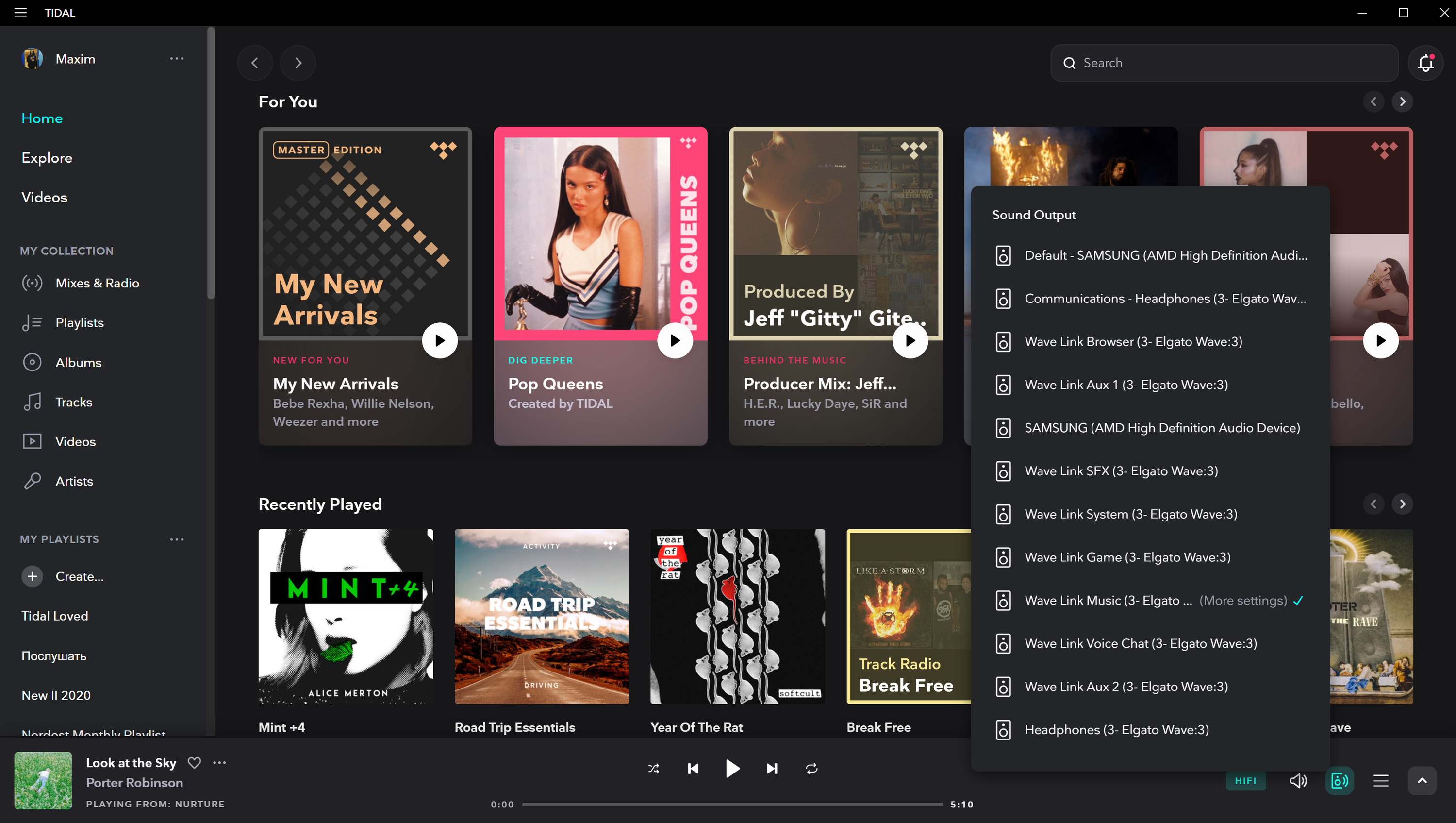 Открываем любимый плеер или стриминговый сервис — у нас под рукой оказался Tidal. Кликаем по выбору выхода и видим, что Wave Link добавил нам несколько новых виртуальных устройств. Выбираем выход Wave Link Music.