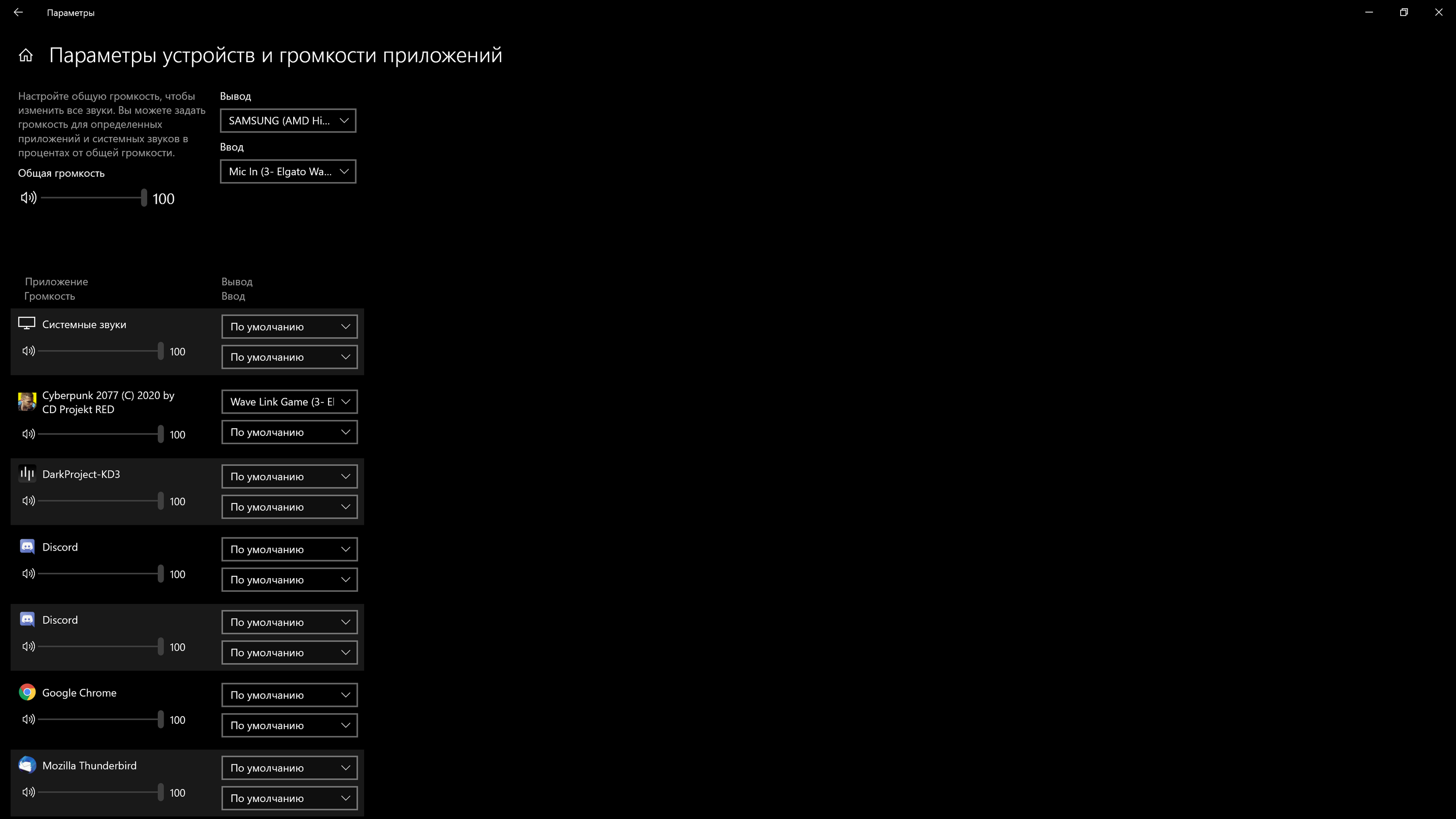 Выбрать нужный выход звука можно не только из меню используемых программ, но и через панель управления операционной системы. Вызывать ее можно с помощью иконки в правом верхнем углу главного окна Wave Link или стандартными средствами. Запустим игру Cyberpunk 2077 и выведем звук с нее на Wave Link Game.