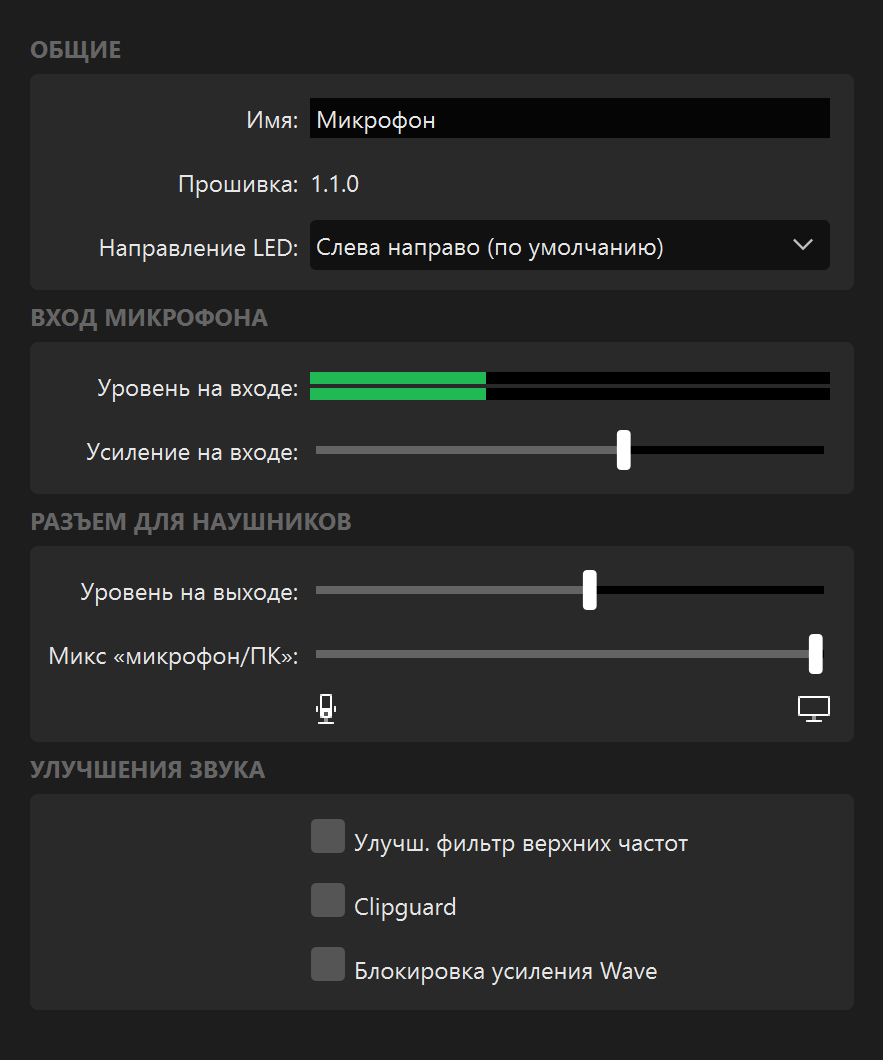 Там мы можем изменить направление LED-индикации, чтоб будет полезно при размещении микрофона в перевернутом виде. Далее у нас идут индикаторы уровня, «ползунки» изменения громкости и соотношения звука микрофона и ПК в миксе. В самом низу расположены чекбоксы, активирующие специальные функции, о которых мы поговорим отдельно. «Улучш. фильтр верхних частот» — на самом деле, конечно, НЧ-фильтр. В англоязычной версии приложения он назван «Enhanced Lowcut Filter».
