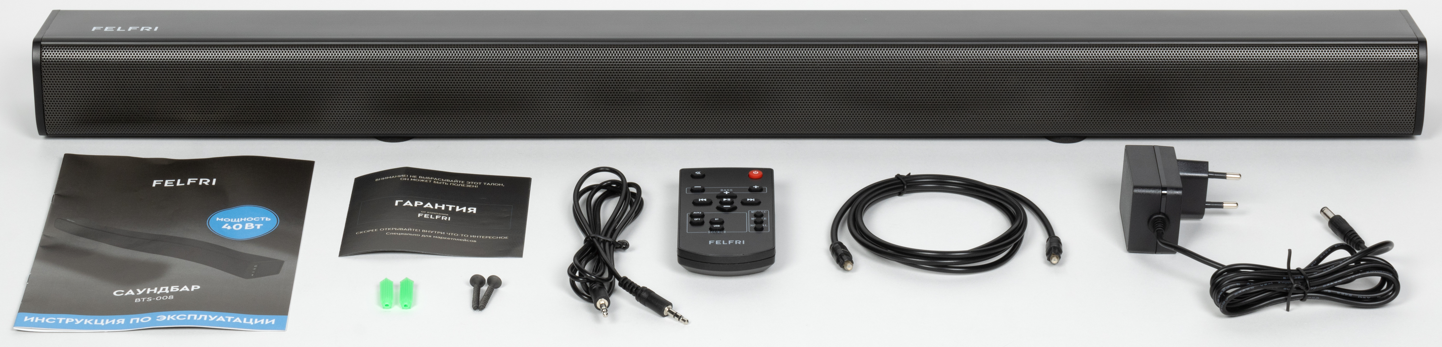 В комплект поставки входят сам саундбар, документация, набор для настенного крепления, аудиокабель с 2 миниджеками, оптический кабель, пульт дистанционного управления, блок питания.