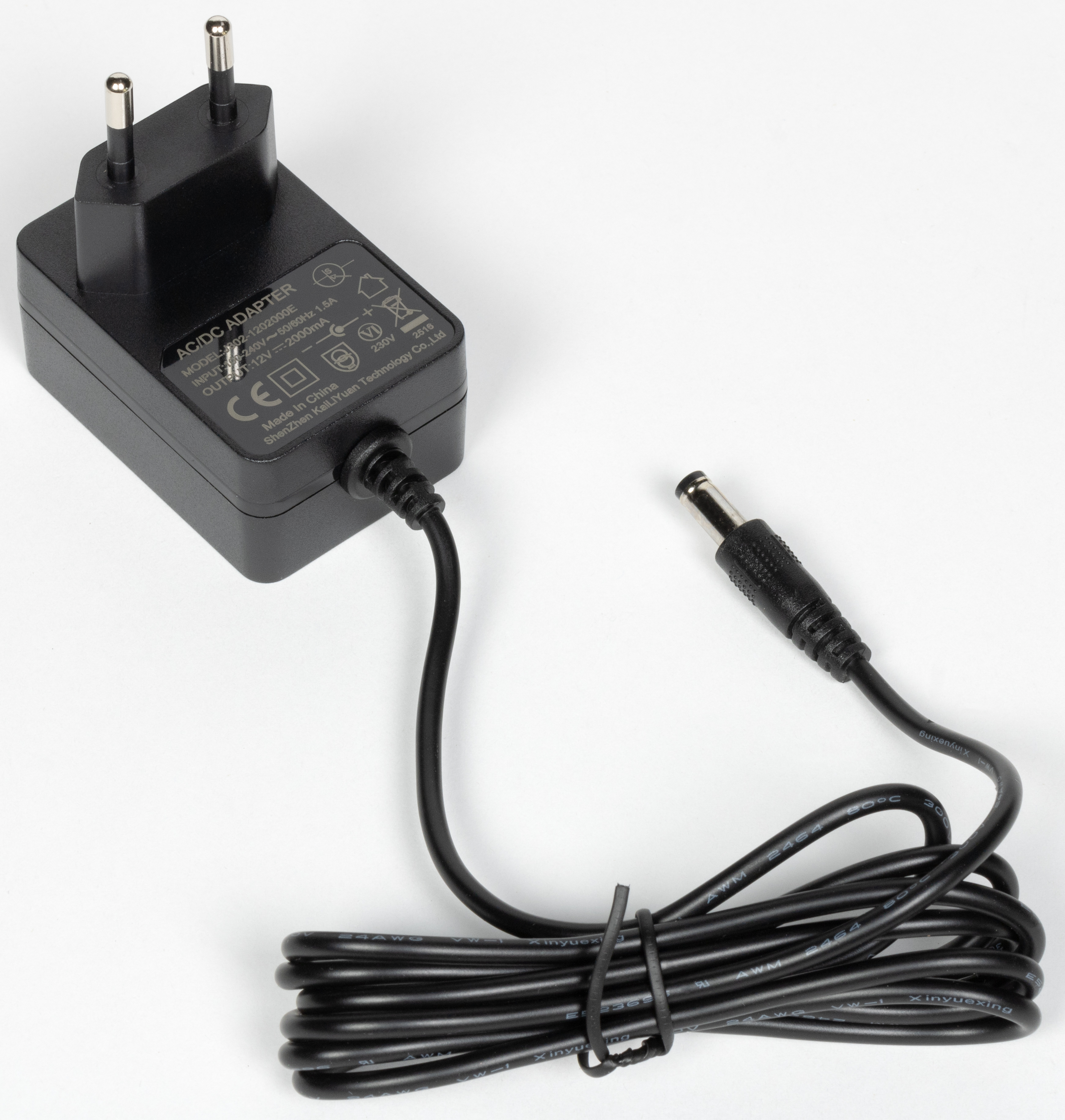 Блок питания выдает 12 В / 2 А. Длина несъемного кабеля — 1,5 метра. Все выполнено на приемлемом уровне качества, коннектор — круглый.