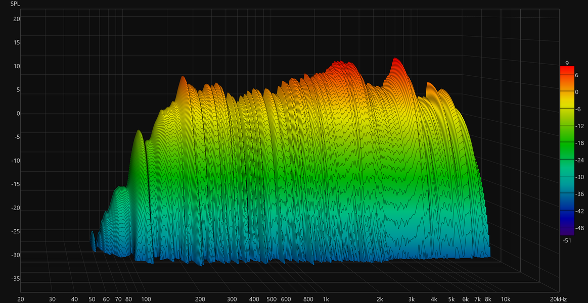 По графику кумулятивного затухания спектра (он же «водопад» или waterfall) хорошо видно, что вклад пассивных излучателей в общее звучание минимален. В области низких частот отсутствует характерное протяженное послезвучие, которое обычно свидетельствует о работе пассивных элементов. Вместо этого наблюдается резкий спад ниже 80 Гц и быстрое затухание.