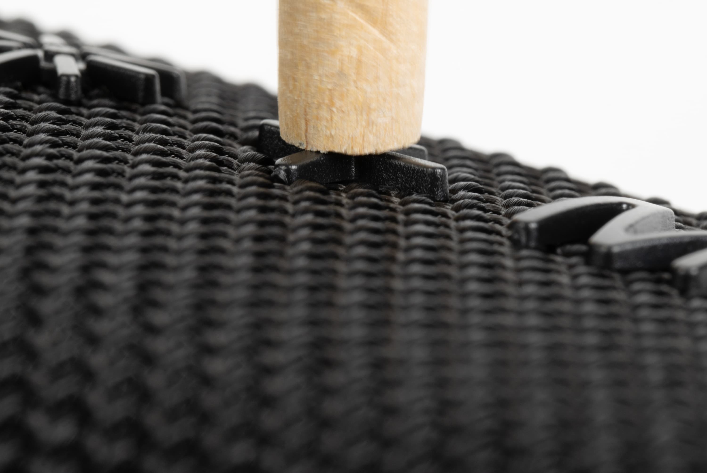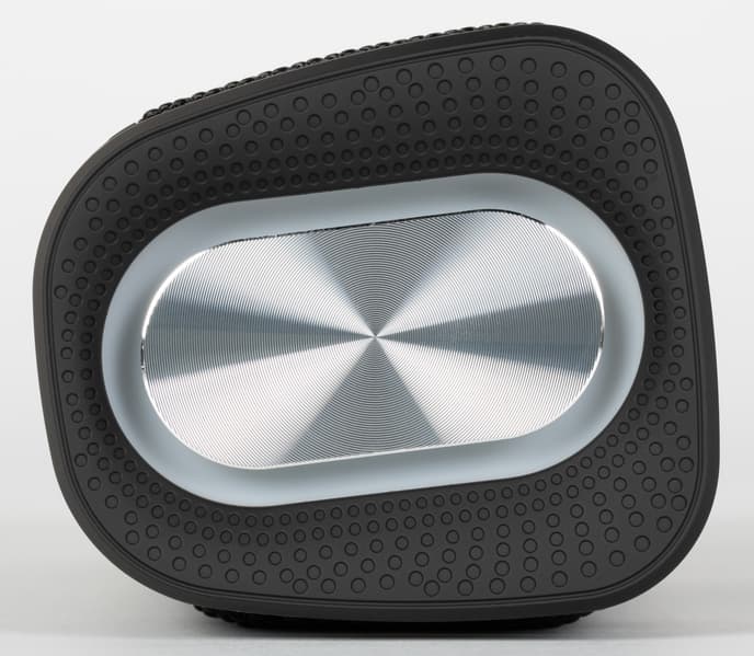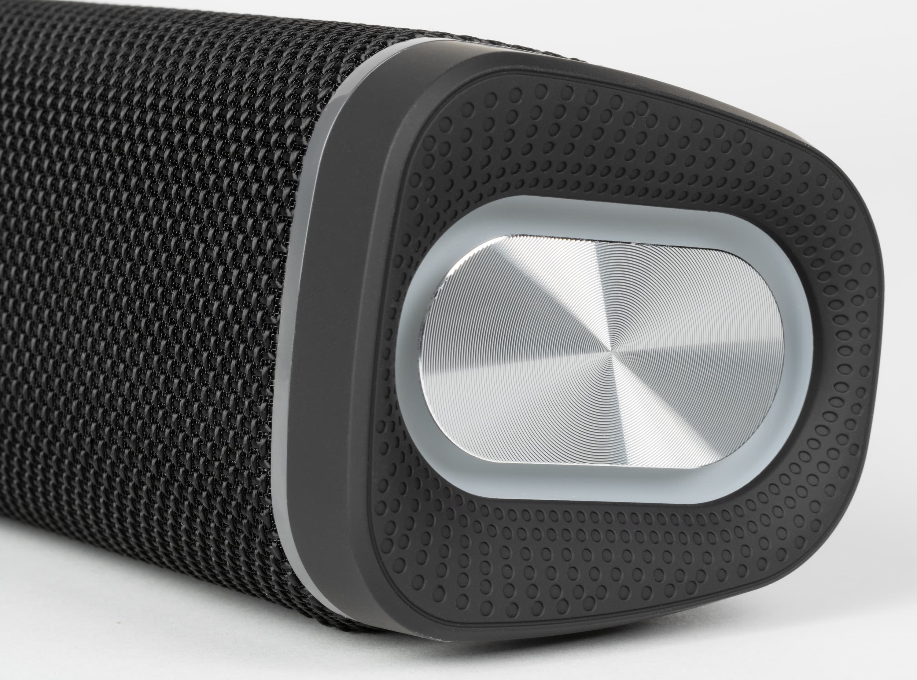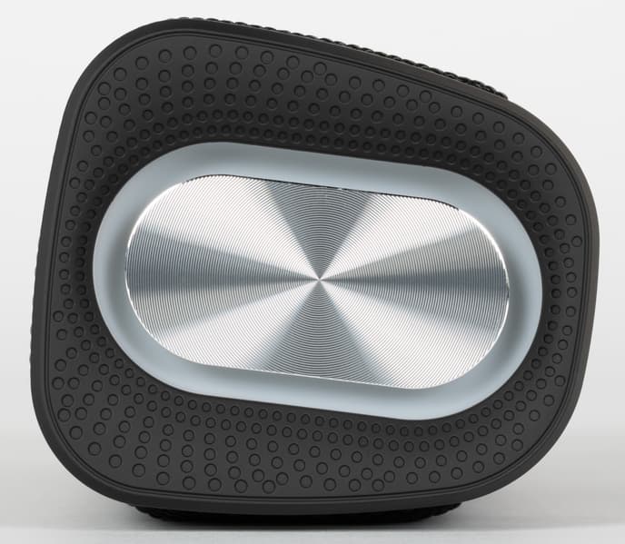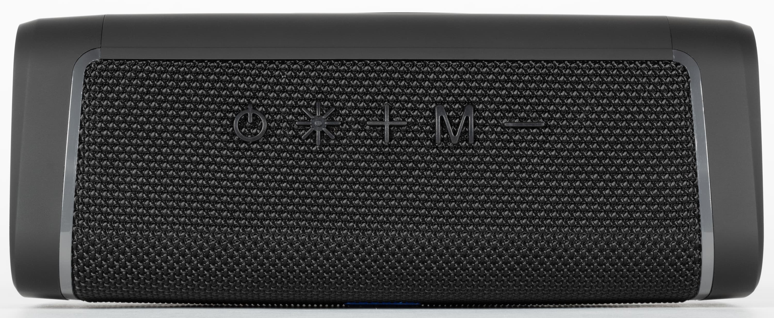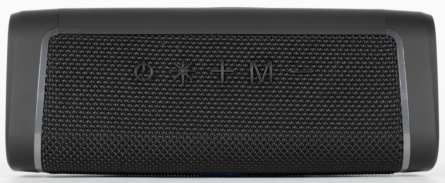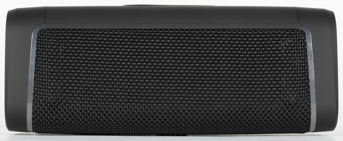 Вся колонка, кроме задней панели, закрыта по периметру прочной тканевой сеткой с довольно эффективной водоотталкивающей пропиткой. Логотип на передней части, о котором мы уже упоминали, держится буквально на одной капле клея. При желании и любви к лаконичному дизайну его можно легко снять, а остатки клея удалить с поверхности с помощью подходящих средств — останется лишь небольшое и едва заметное углубление на сетке.