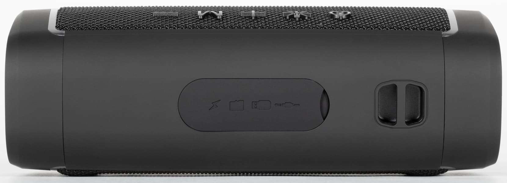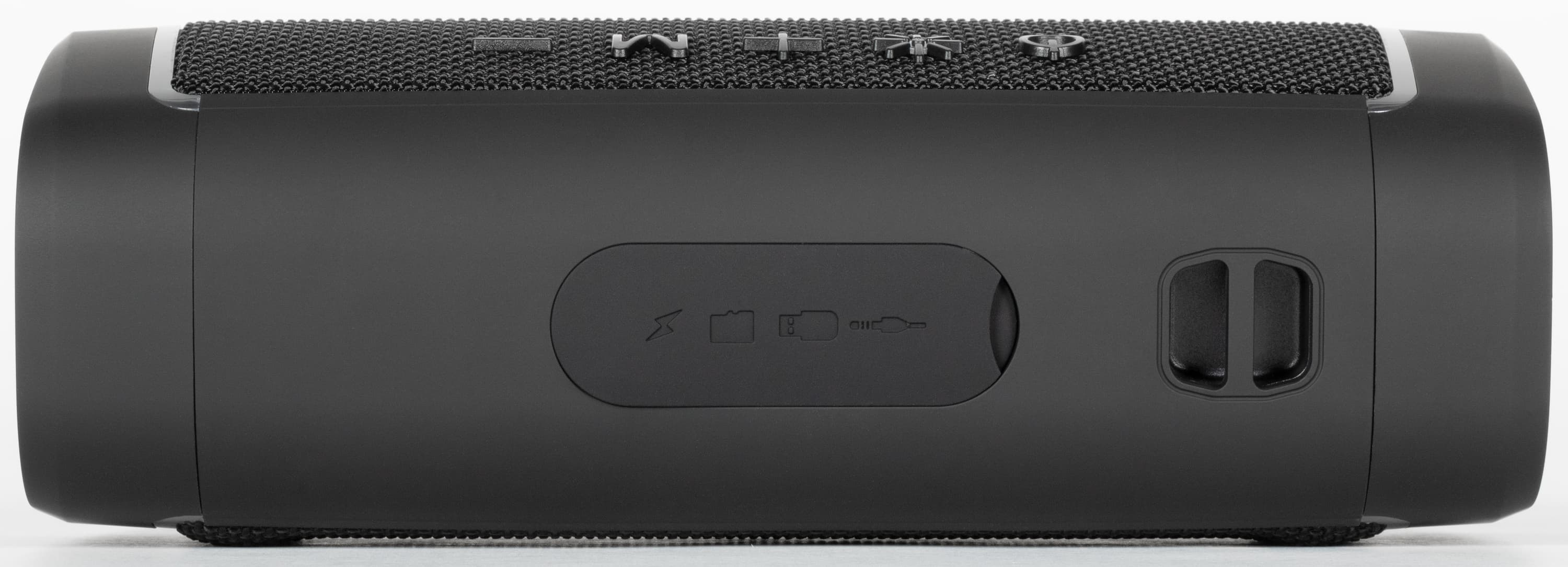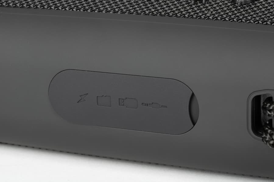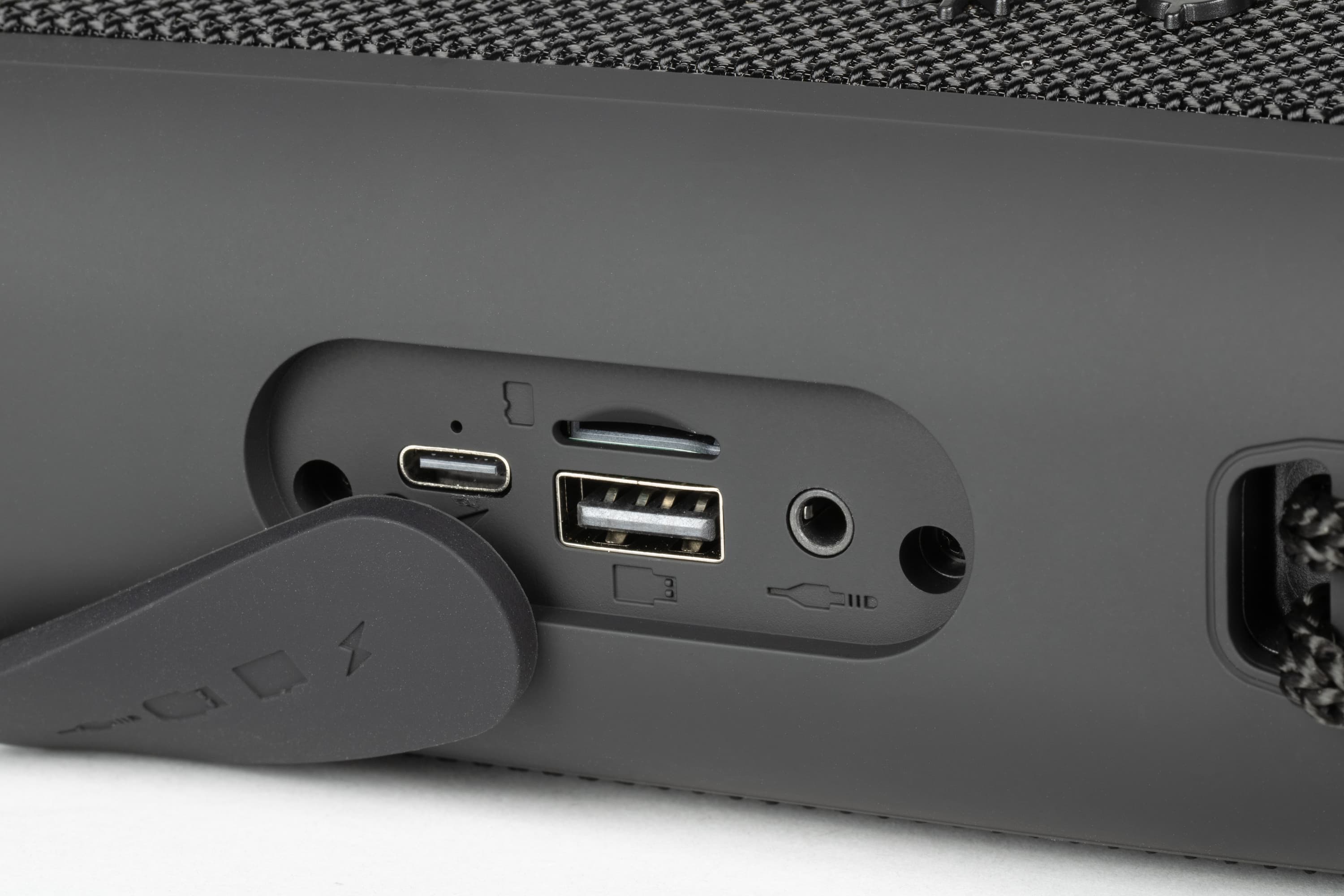 Резиновая заглушка на задней панели открывается легко, но закрывается не с первого раза — нужно прижать ее в нескольких точках, чтобы добиться плотного прилегания. Под крышкой собраны все основные разъемы: порт USB Type-C для зарядки с небольшим индикатором состояния над ним, далее — USB для флеш-накопителей, слот для карт памяти и миниджек для проводного подключения источника звука. При подключении кабеля питания заглушка немного мешает — приходится сдвигать ее в сторону с заметным усилием. Мелочь, но именно такие детали формируют общее ощущение продуманности конструкции — у колонок подороже такое практически не встречается.