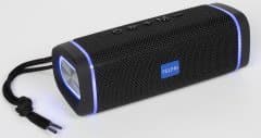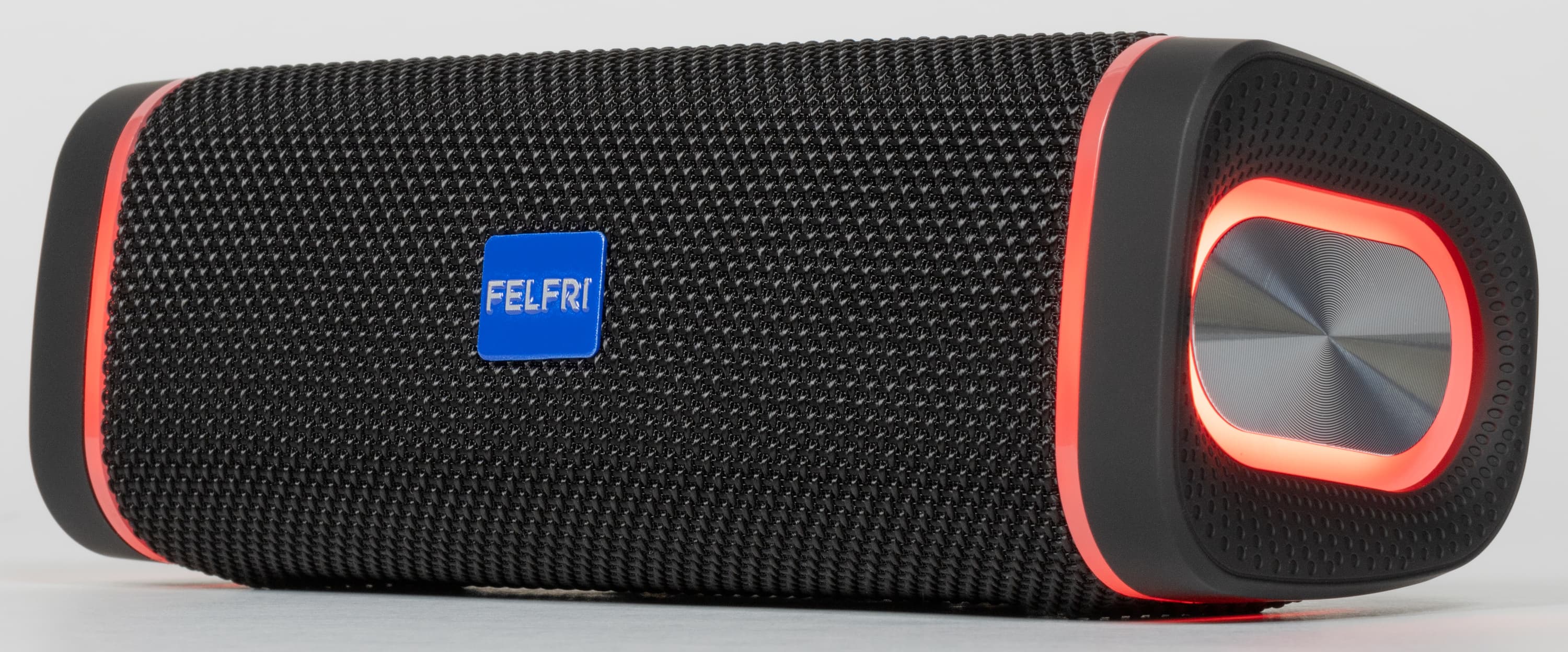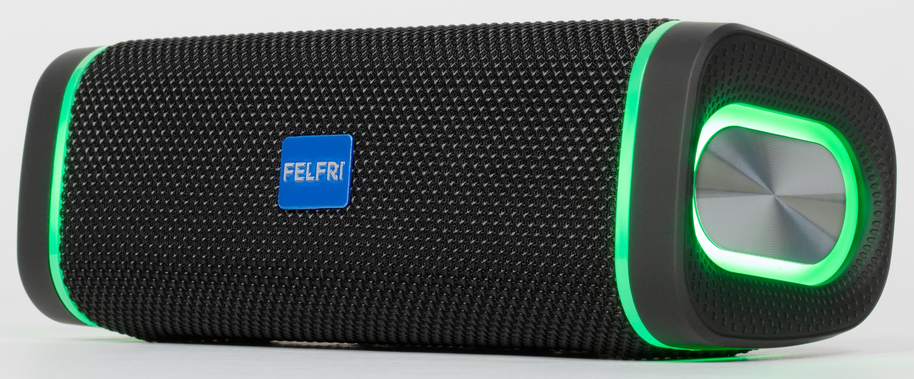 По дизайну Felfri BTS-012 больше напоминает мини-саундбар, но все же это полноценная портативная колонка, рассчитанная на то, что пользователь будет носить ее с собой. Внешне устройство выглядит симпатично, его принадлежность к бюджетному сегменту выдает разве что логотип на передней панели — выполнен он не слишком аккуратно и выглядит немного чужеродно. Зато подсветка приятная, удачно расположена и делает оформление более эффектным.