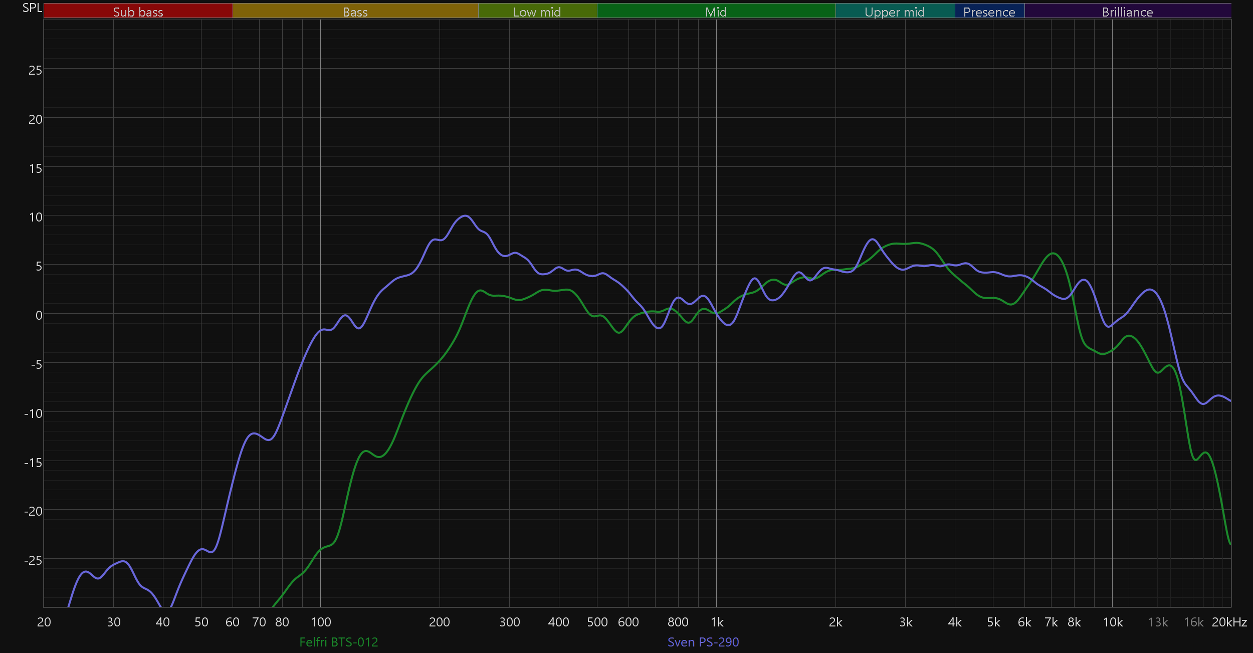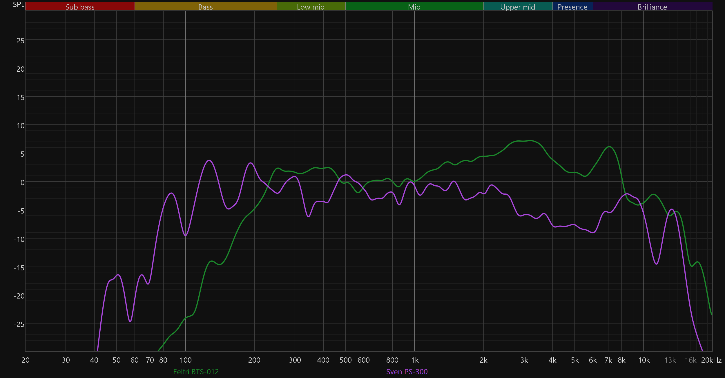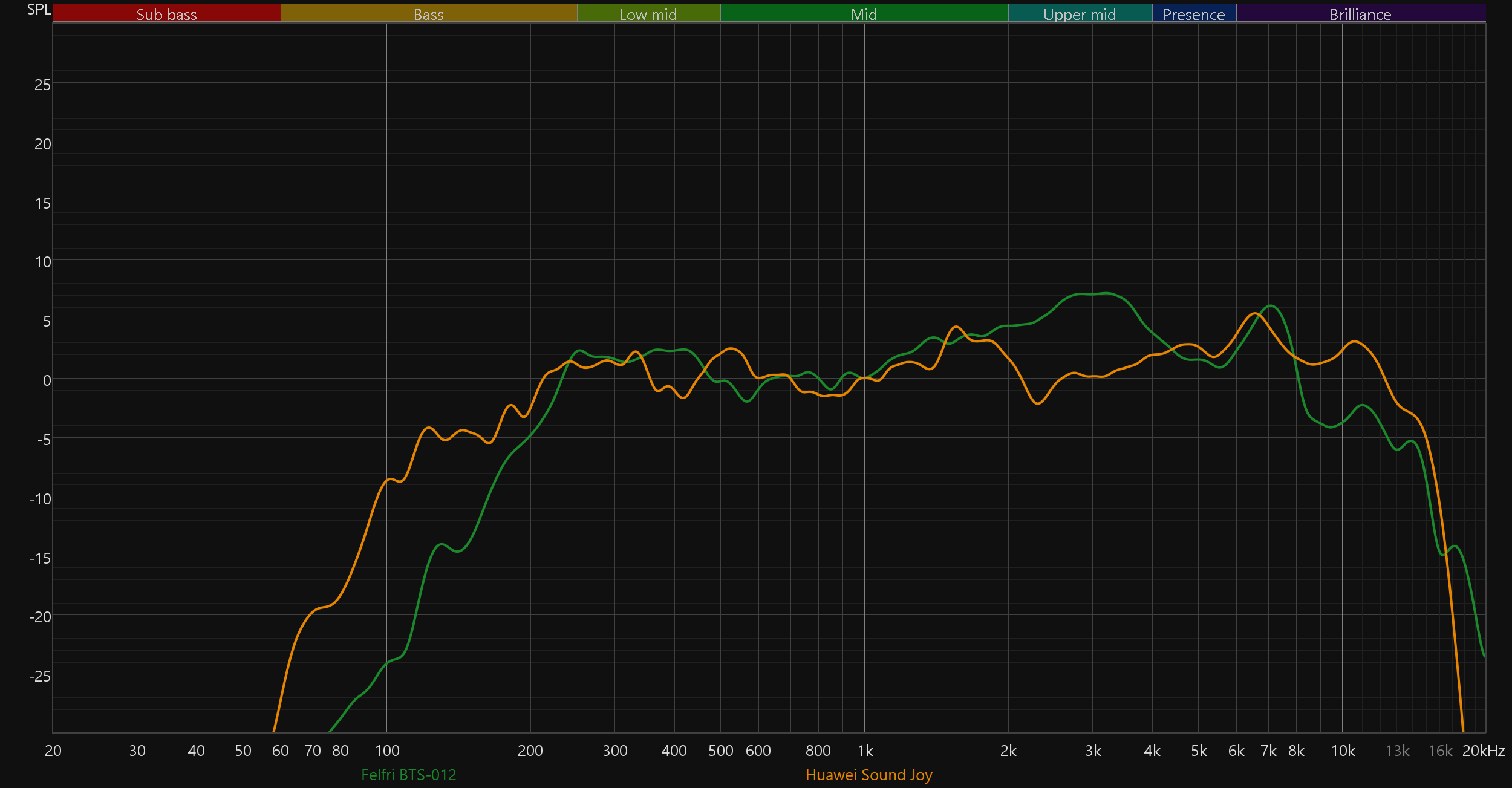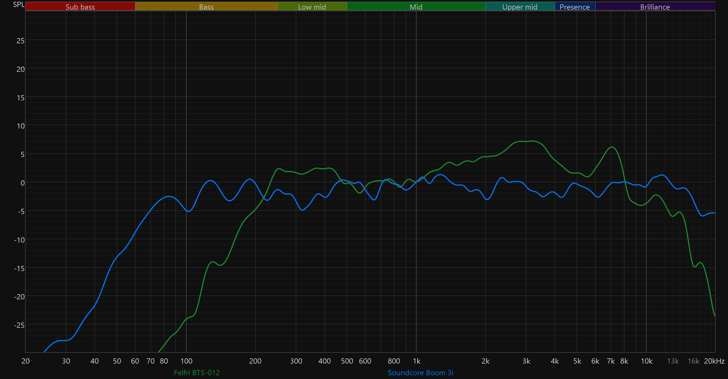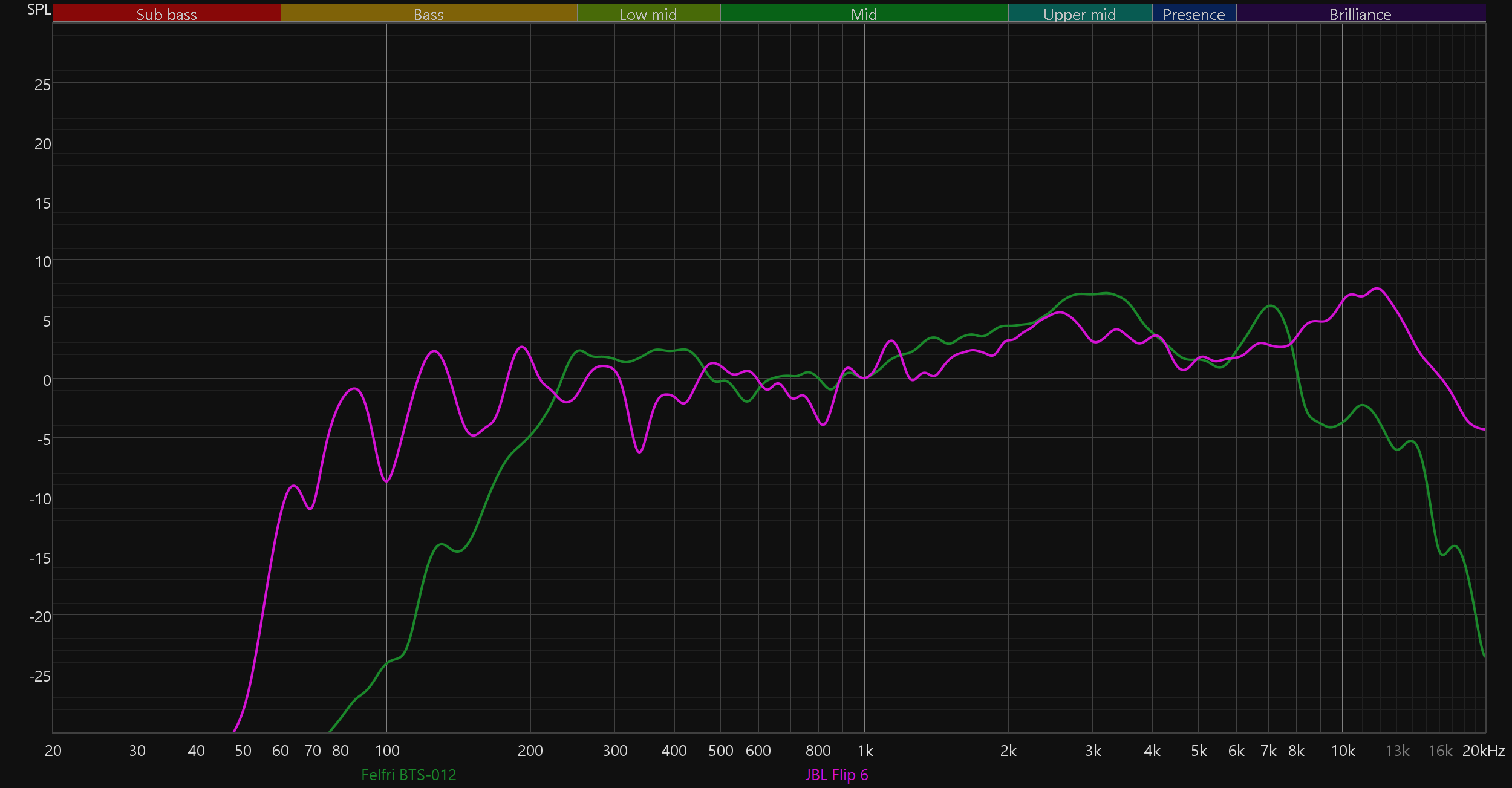 Сравним графики АЧХ Felfri BTS-012 и нескольких портативных колонок из наших прошлых тестов — от самых продвинутых моделей до крепких середнячков. Разница очевидна, комментировать здесь особенно нечего. Но важно отметить: цена у конкурентов выше в разы — сравнение скорее показывает, за что предлагается доплатить пользователю, чем является поводом для критики тестируемой модели.